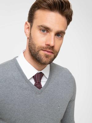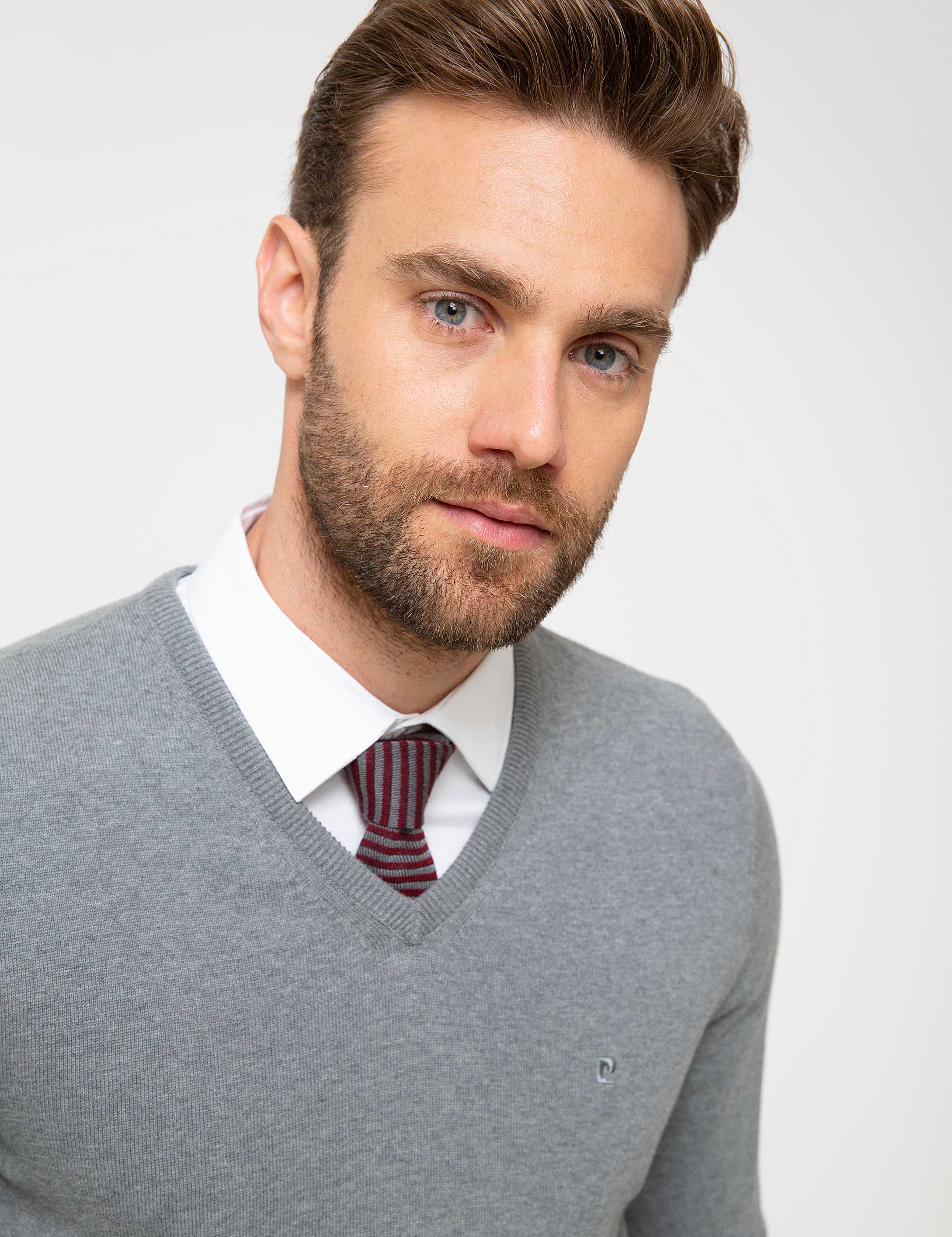 Gri Melanj Slim Fit V Yaka Basic Triko Kazak