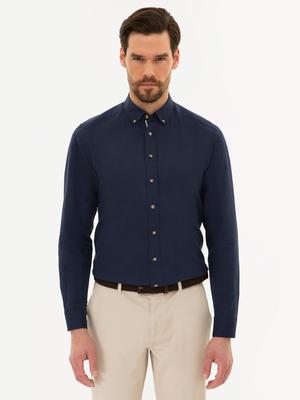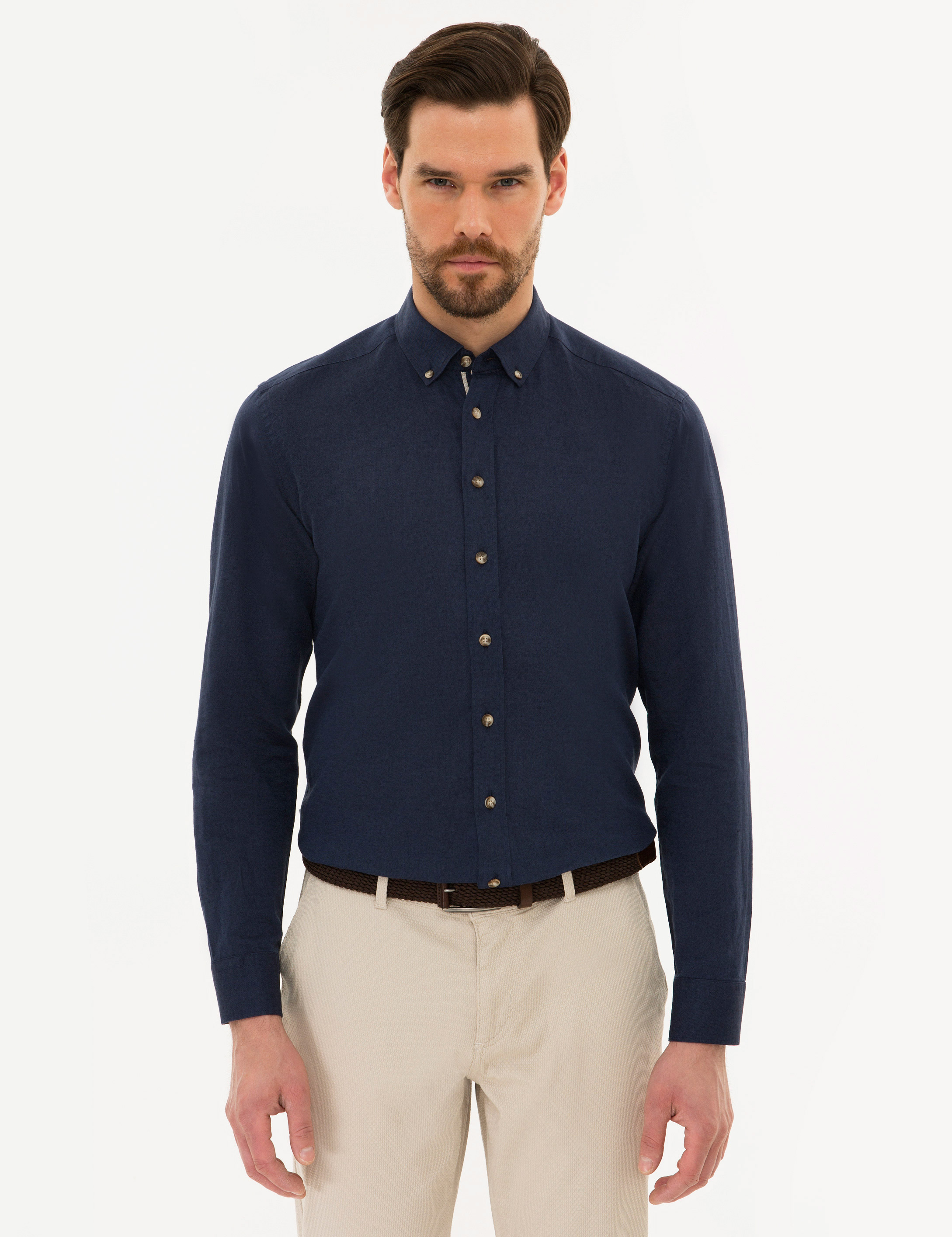 Lacivert Slim Fit Keten Karışımlı Gömlek