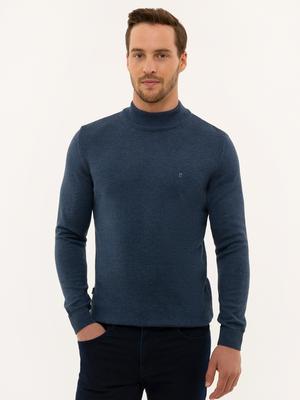 İndigo Mavi Melanj Slim Fit Yarım Balıkçı Yaka Basic Triko Kazak