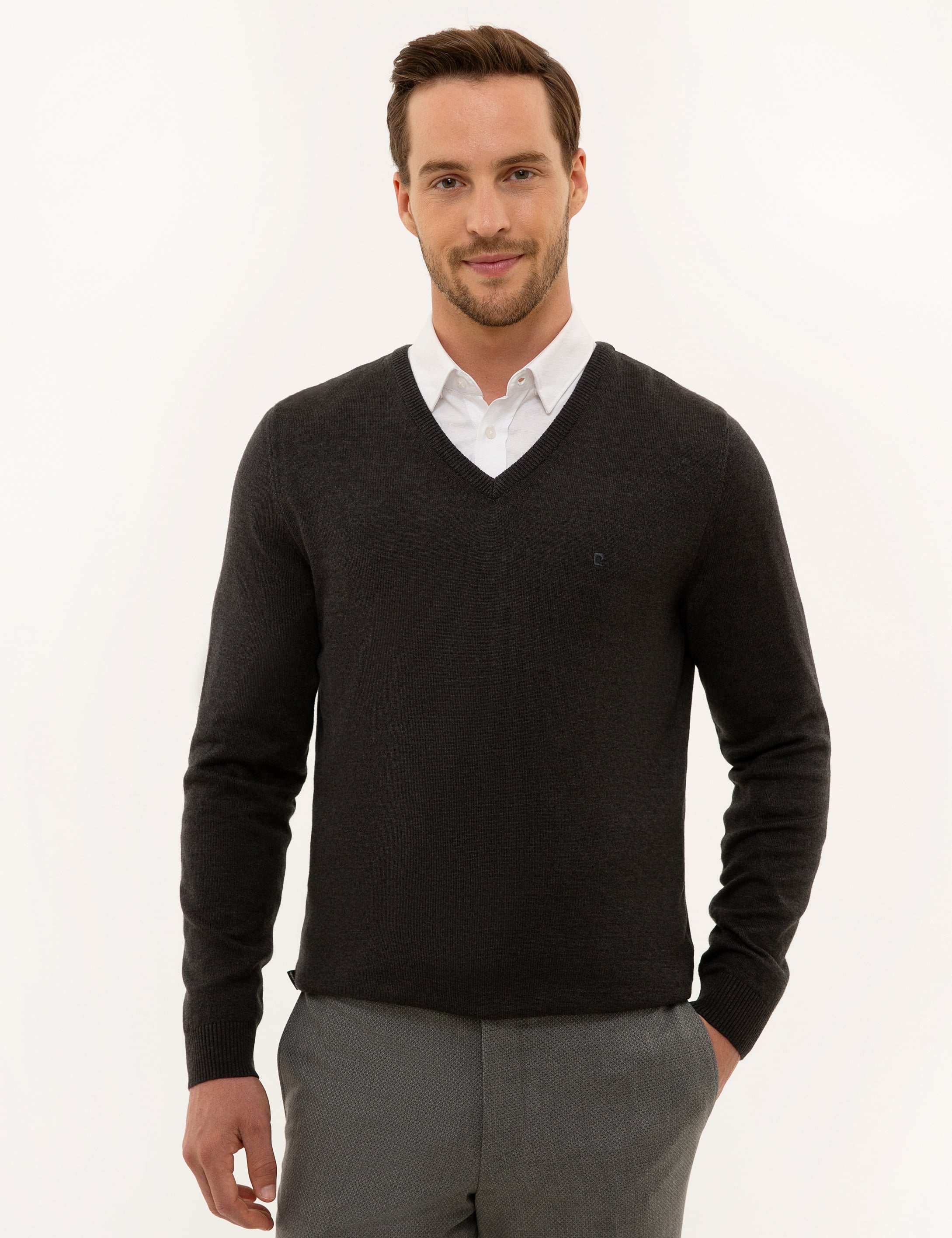 - Antrasit Melanj Slim Fit V Yaka Basic Triko Kazak