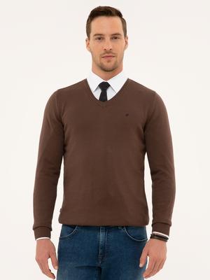 - Kahverengi Slim Fit V Yaka Basic Triko Kazak