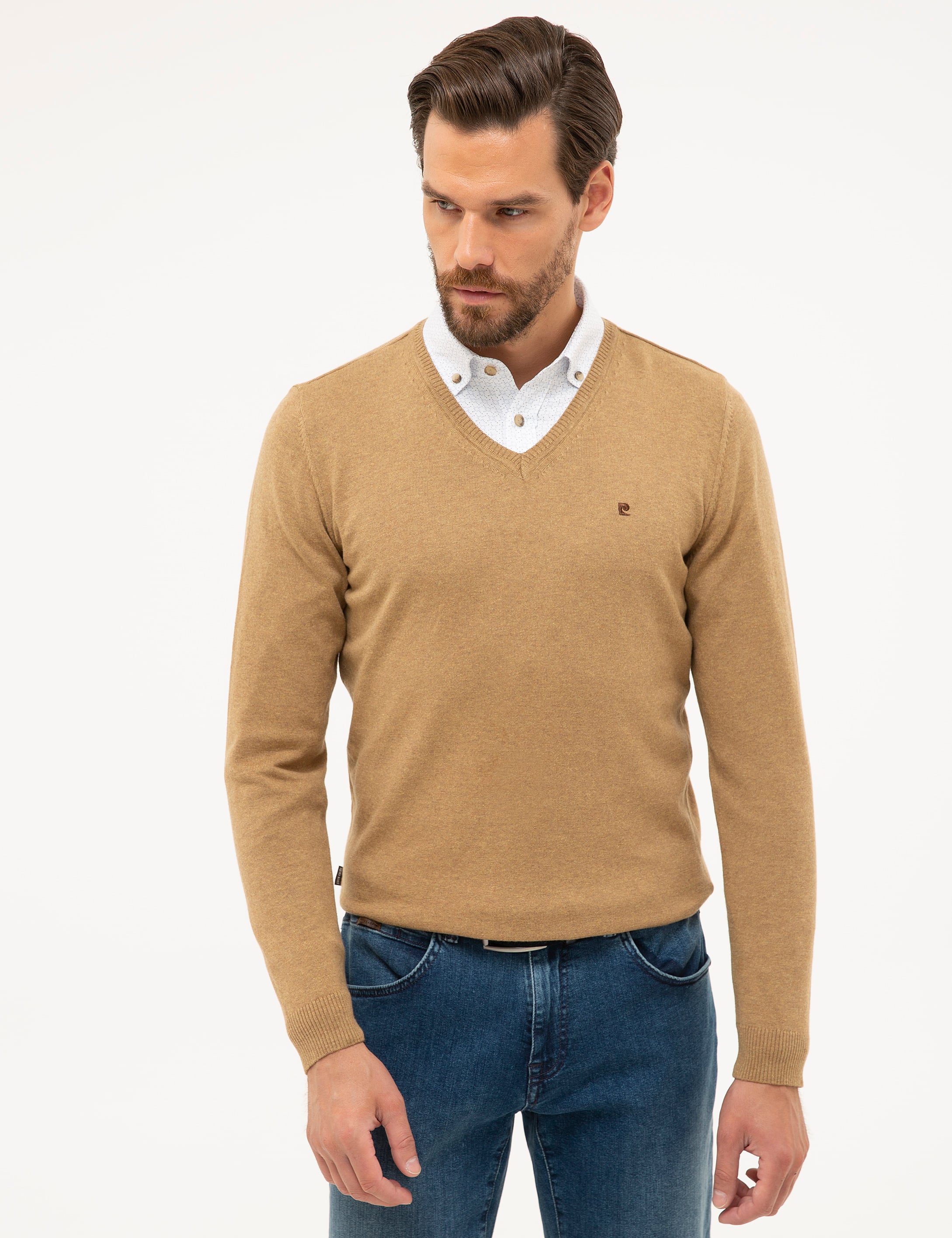 - Camel Melanj Slim Fit V Yaka Basic Triko Kazak