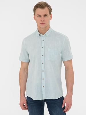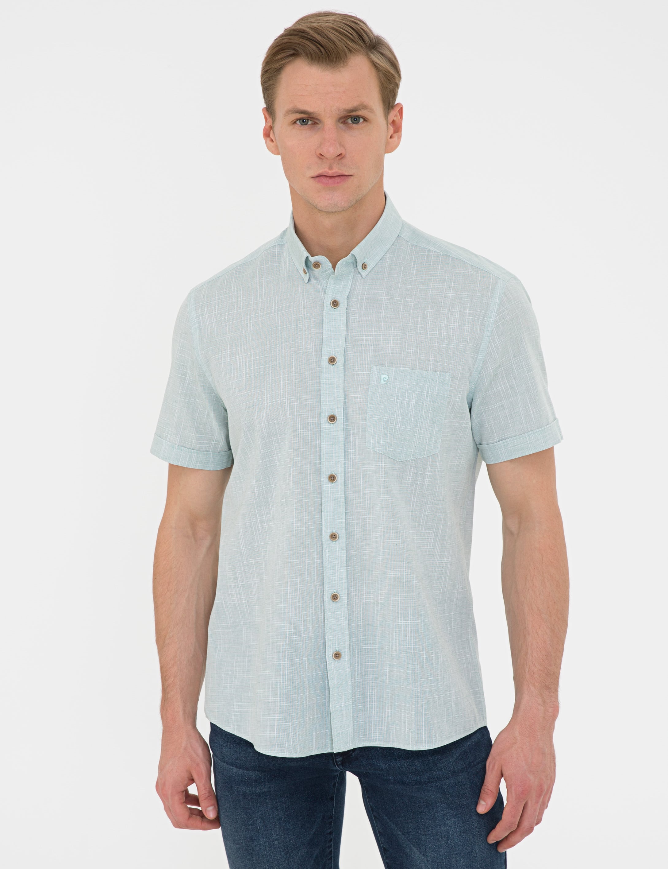 - Yeşil Regular Fit Keten Görünümlü Kısa Kollu Gömlek