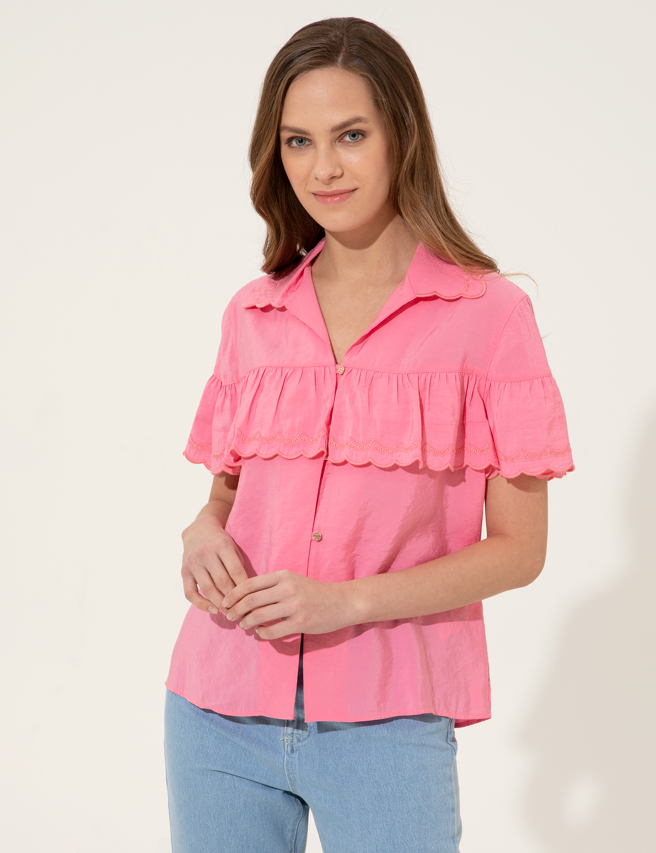 Fuşya Crop Top Kısa Kollu Gömlek