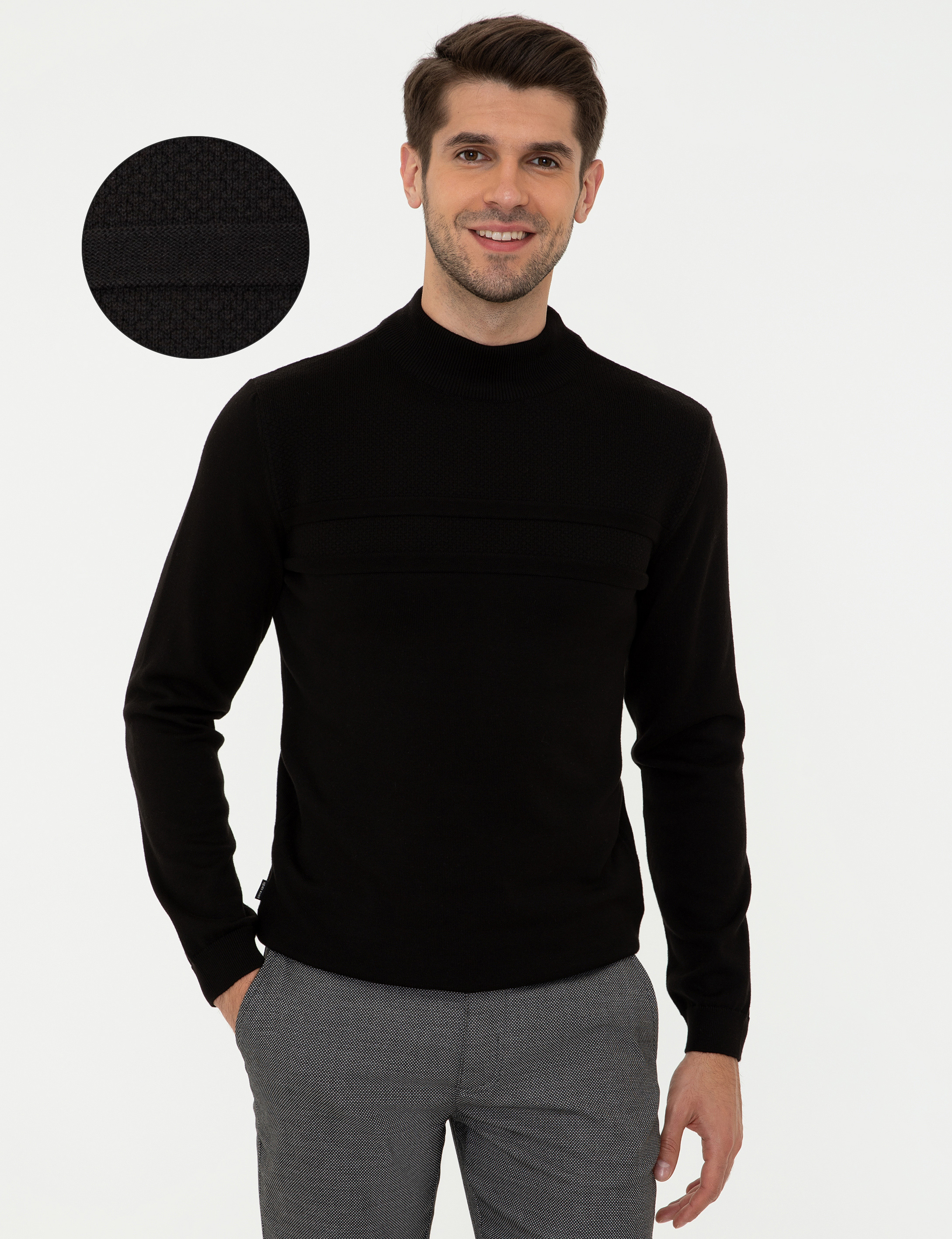 - Siyah Slim Fit Yarım Balıkçı Yaka Triko Kazak