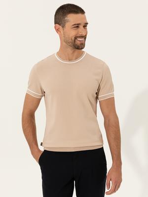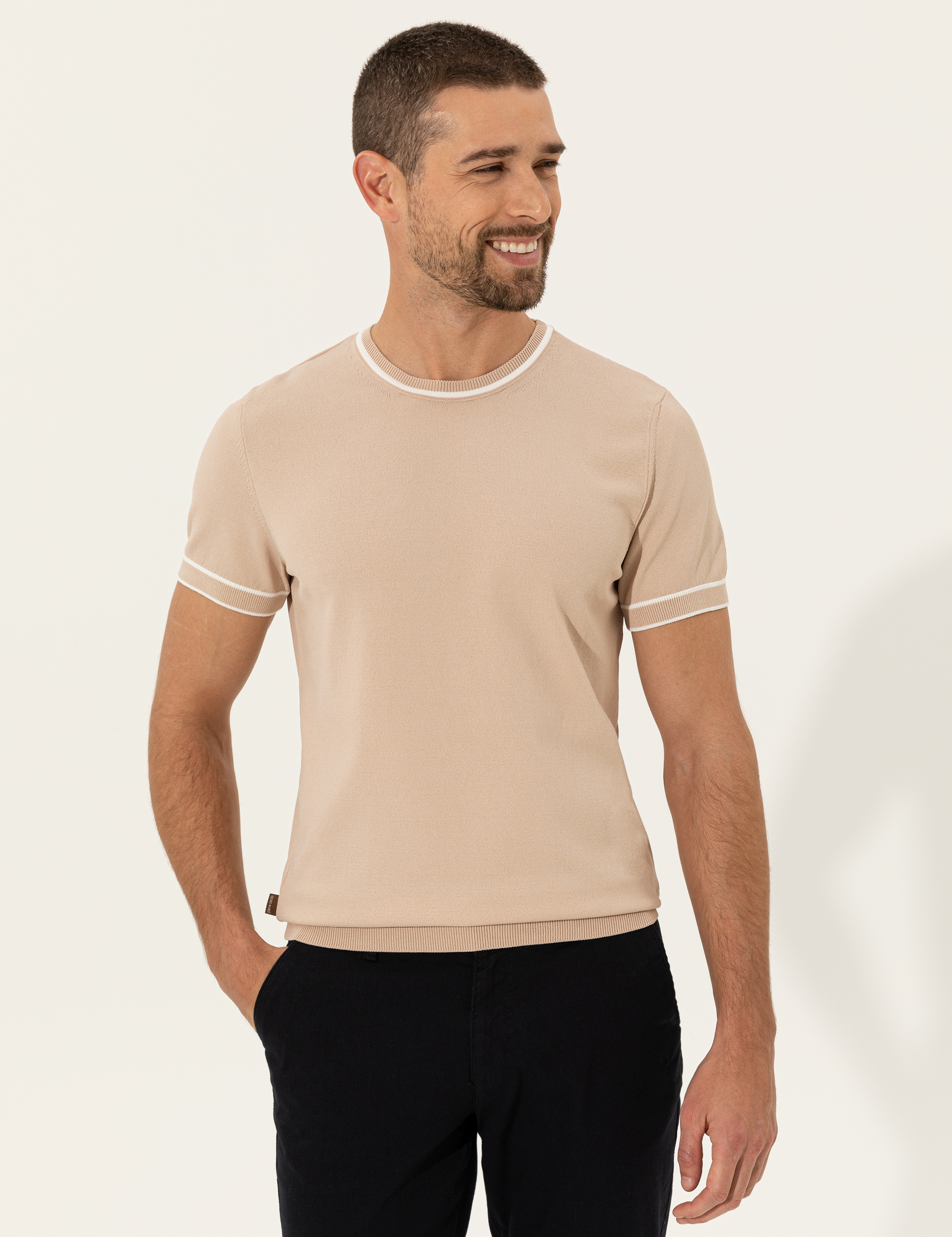 Bej Slim Fit Bisiklet Yaka Triko Tişört