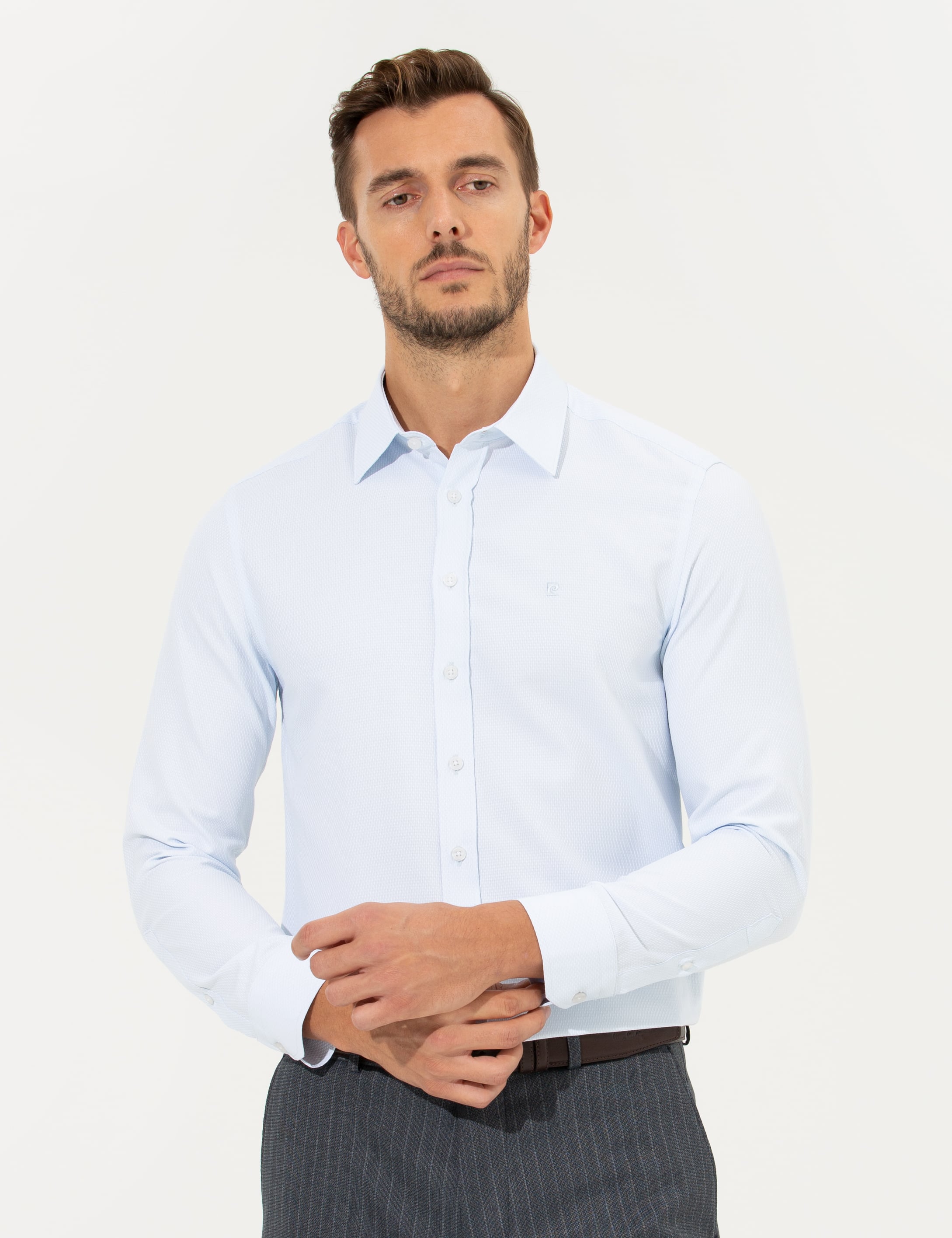 - Açık Mavi Slim Fit Armürlü Klasik Gömlek