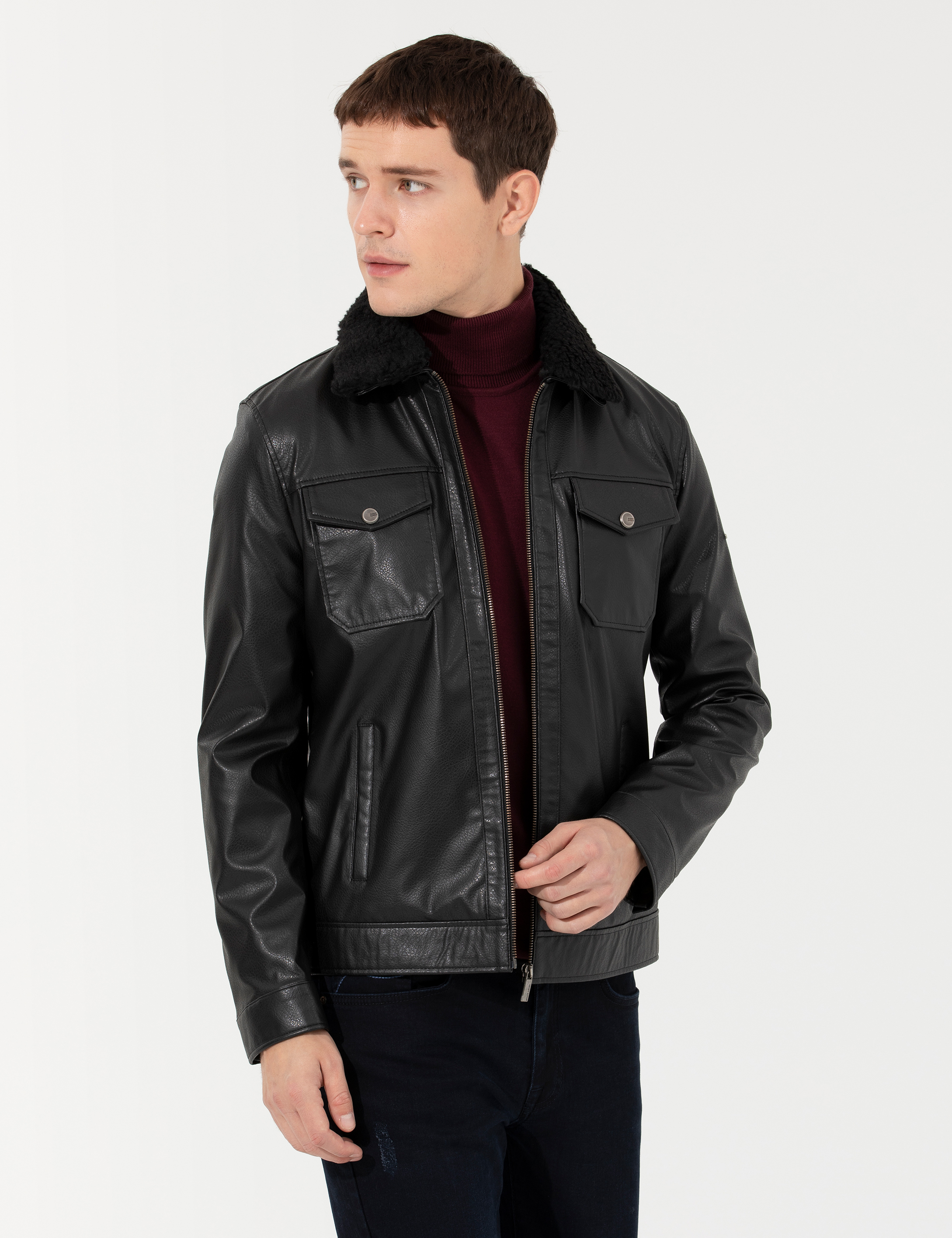 *Şık ve konforlu tasarımını çıkarılabilir kürklü yaka detayla zenginleştirdiğimiz %100 poliüretan erkek ceket modelimiz standart fit kesime sahiptir.