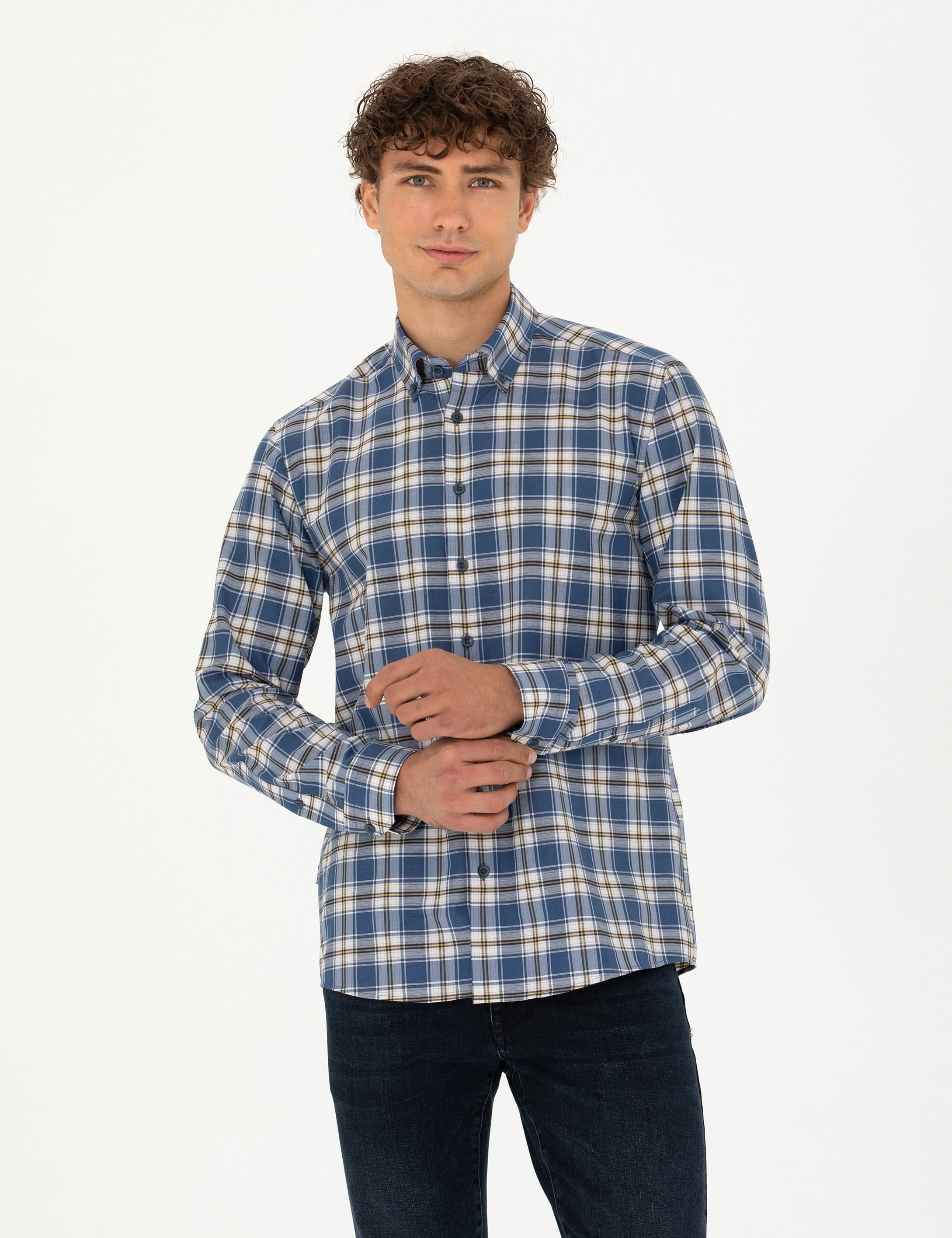 Ekose deseniyle klasik bir görünüm sunan lacivert uzun kollu gömlek, hem şıklığı hem de rahatlığı bir araya getirmektedir. Slim fit kesimi sayesinde vücuda tam oturarak şık ve modern bir duruş sergilemektedir. Düğmeli yaka detayı, gömleğin hem günlük hem de yarı resmi ortamlarda rahatlıkla kullanılmasını sağlamaktadır.
