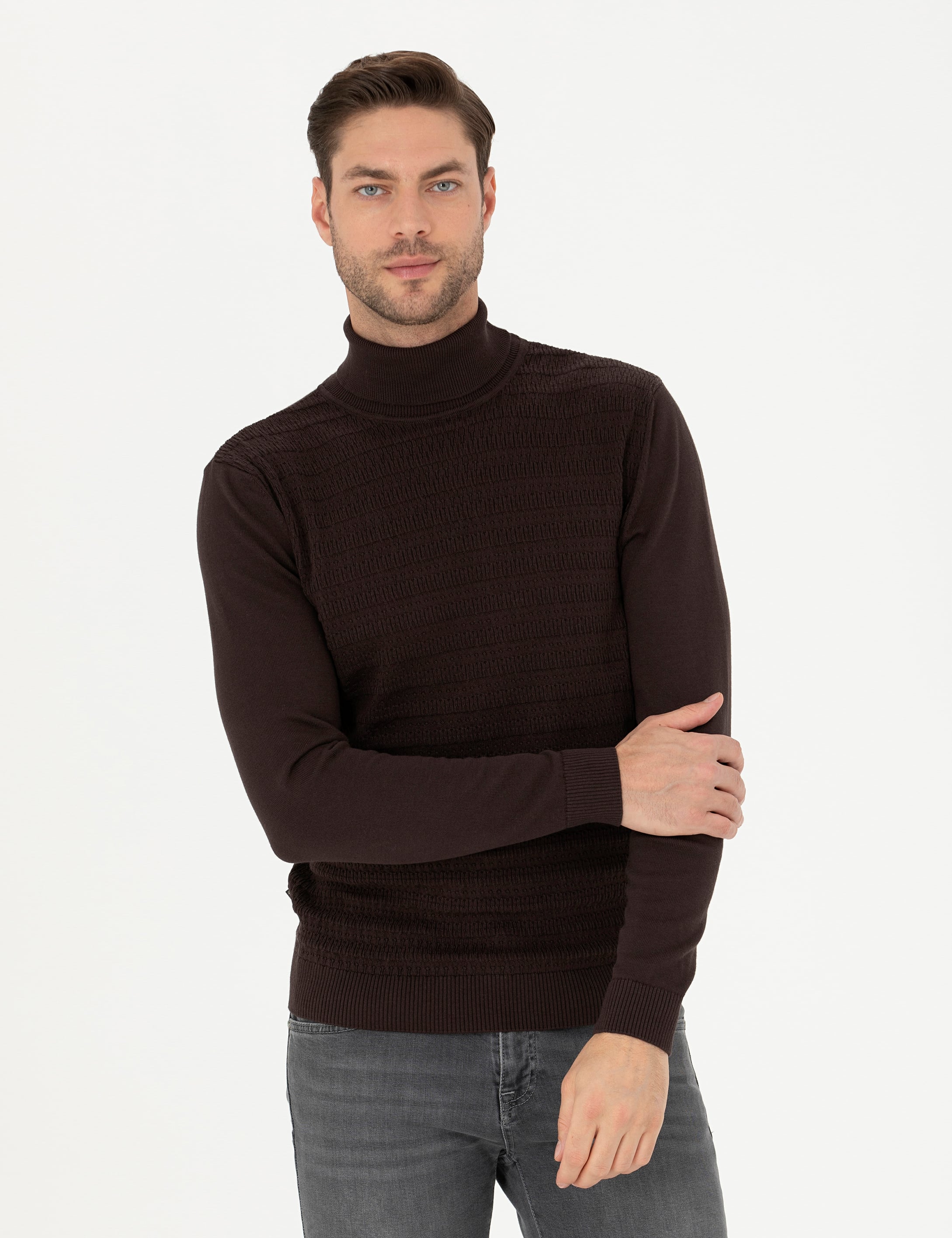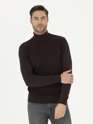 Kahverengi Slim Fit Balıkçı Yaka Triko Kazak