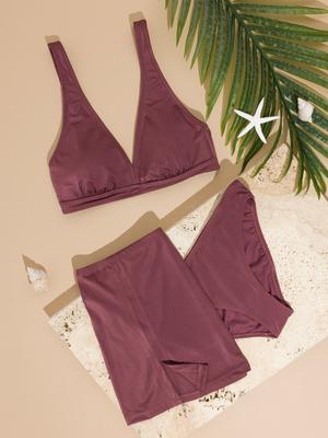Kadın etekli bikini, %85 Poliester %15 Elastan - Spandeks malzemeden üretilmiştir, rahatlık ve şıklığı bir araya getiriyor. Bu özel kadın 3'lü takım bikini, göğüs kısmında sabit soft ped ve toparlayıcı özellikle konforu ön planda tutuyor. Ayarlanabilir omuz askıları ve metal sırt tokası ile tamamlanan tasarım, bikini altının klasik kesimiyle harmonize oluyor. Eşsiz kısa etekli bikini takımının eteği, önden mini yırtmaç detayıyla dikkat çekiyor. Bu kadın etekli bikini takımı tam size göre.