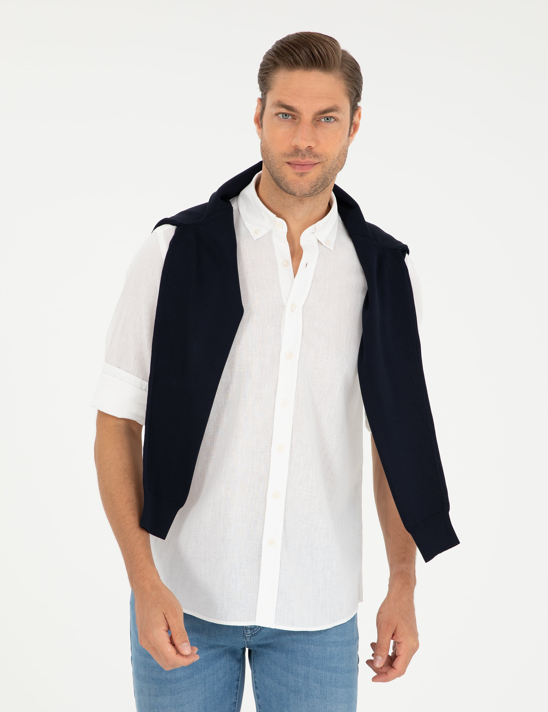 - Beyaz Keten Karışımlı Regular Fit Uzun Kollu Gömlek
