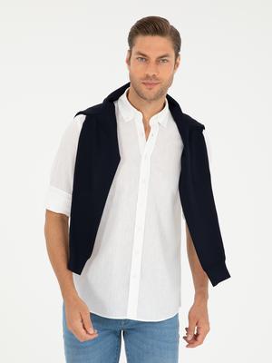 Beyaz Keten Karışımlı Regular Fit Uzun Kollu Gömlek