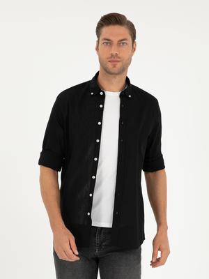 - Siyah Keten Karışımlı Regular Fit Uzun Kollu Gömlek