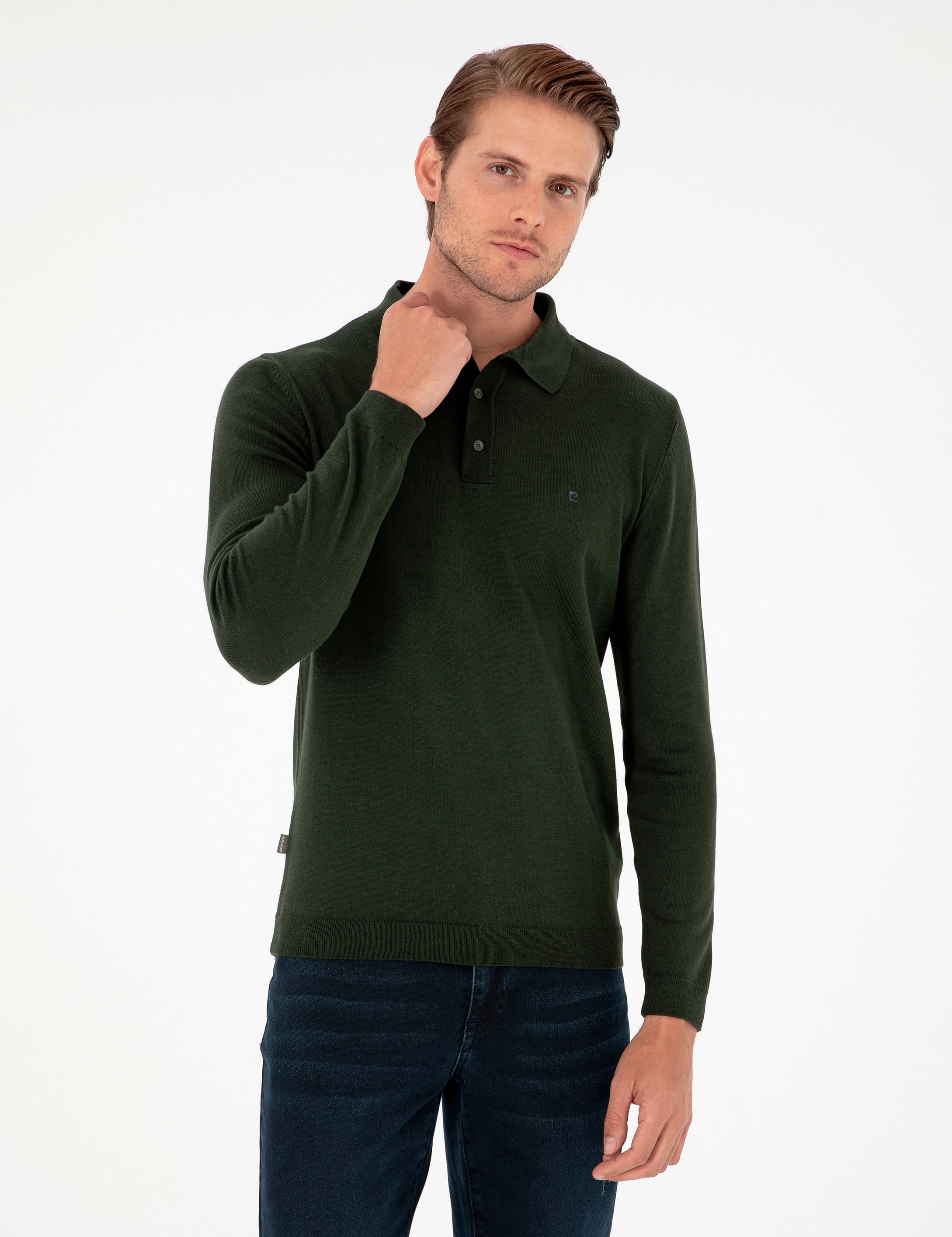 - Koyu Yeşil Slim Fit Polo Yaka Basic Triko Kazak