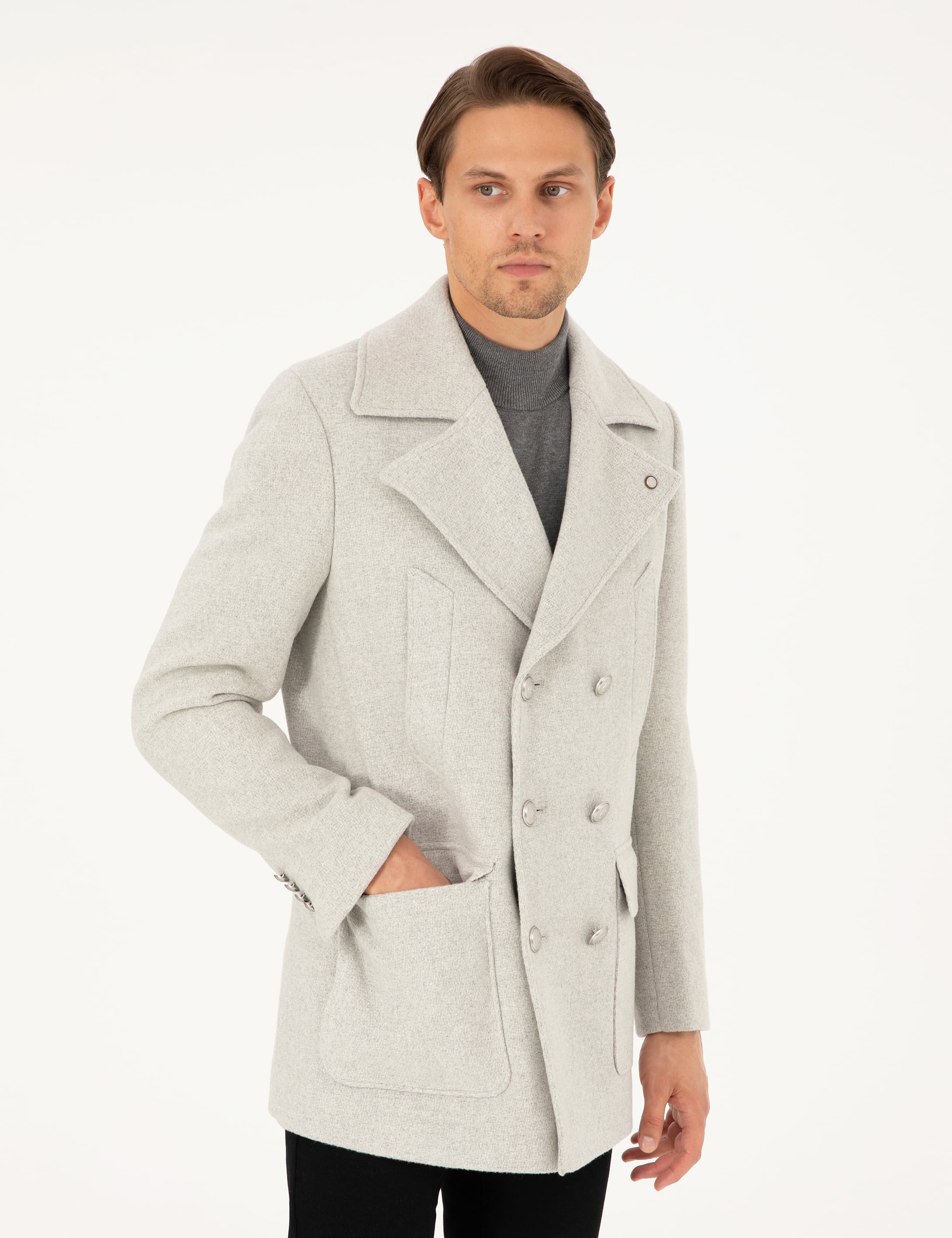 Açık Gri Ex. Slim Fit Yün Karışımlı Kruvaze Kaşe Kaban