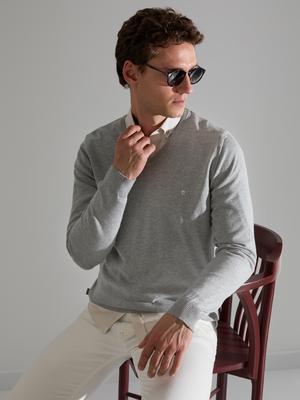 Açık Gri Melanj Slim Fit V Yaka Basic Triko Kazak