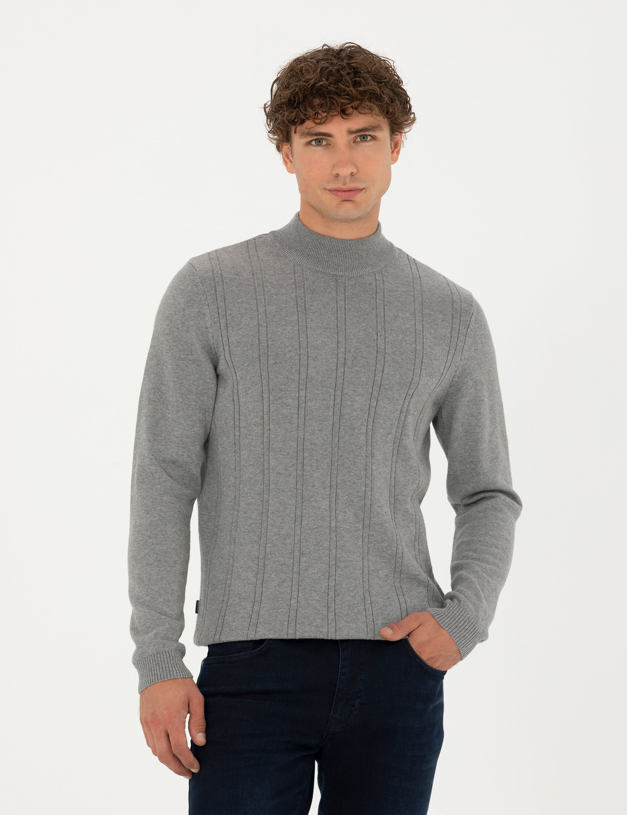 - Açık Gri Melanj Slim Fit Yarım Balıkçı Yaka Triko Kazak