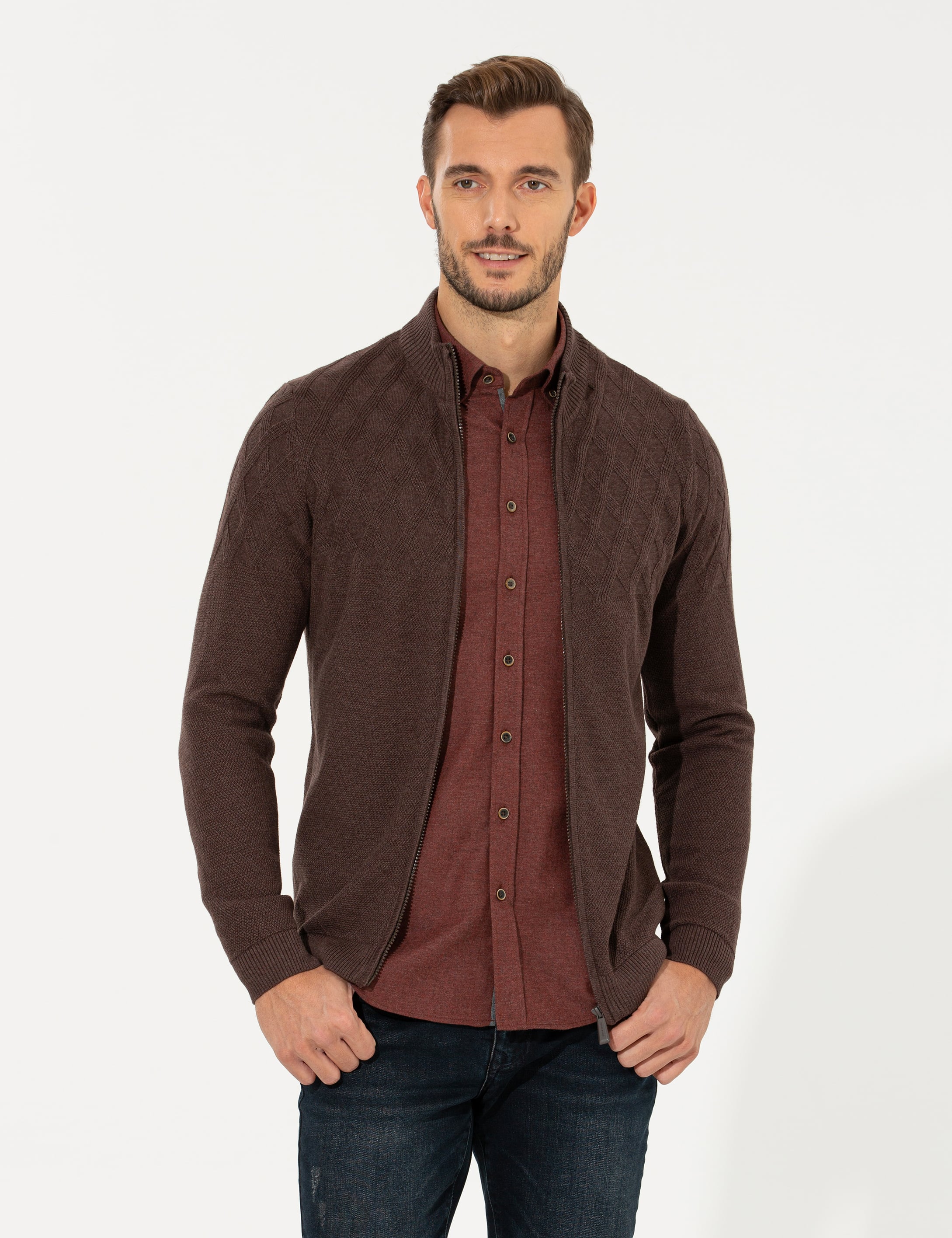 Açık Kahverengi Slim Fit Fermuarlı Triko Hırka