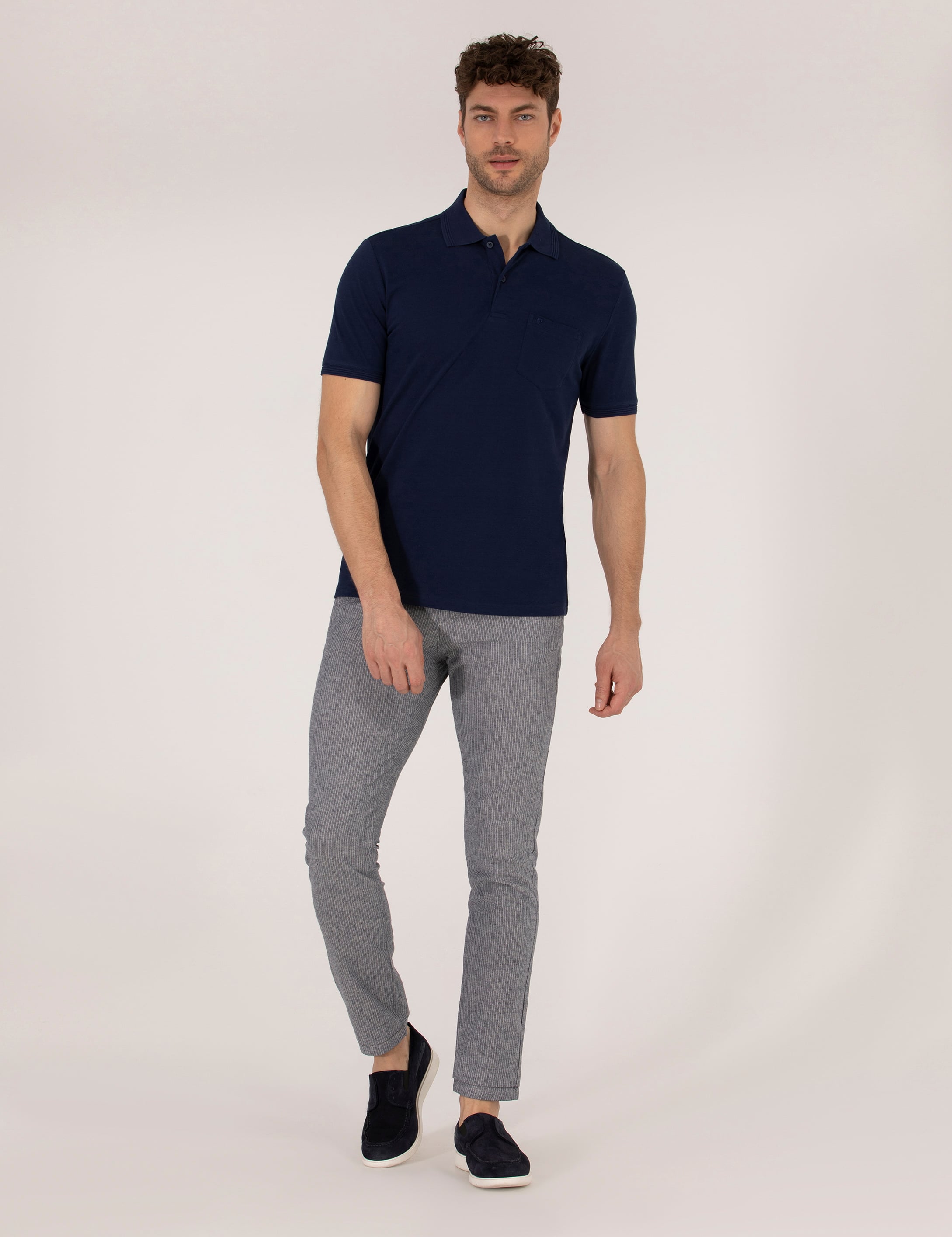 Açık lacivert Pierre Cardin slim fit kanvas pantolon, keten karışımıyla hafiflik ve nefes alabilirlik sağlar.