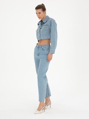 Açık Mavi Parlak Taşlı Mom Fit Jean Pantolon
