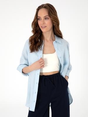 - Açık Mavi Oversize Uzun Kollu %100 Keten Gömlek