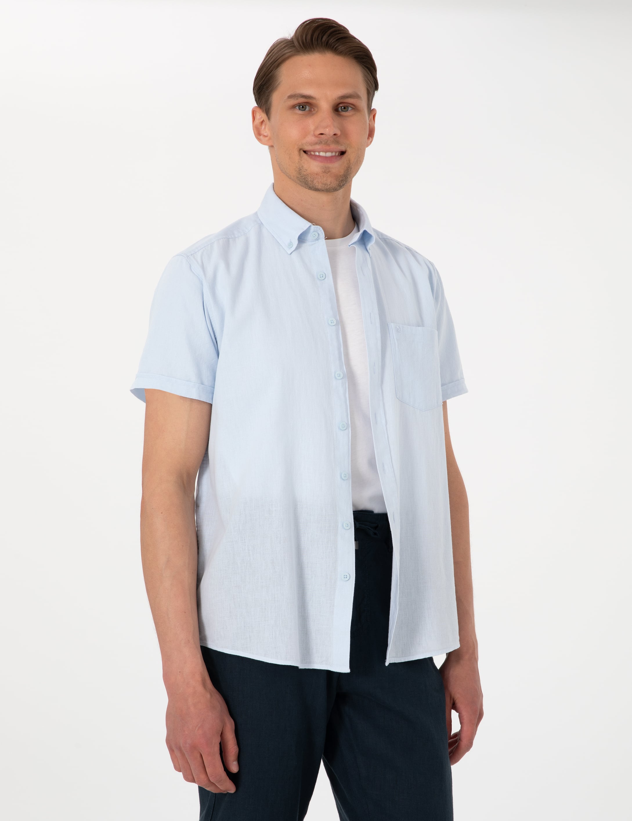 Açık Mavi Keten Karışımlı Regular Fit Kısa Kollu Gömlek