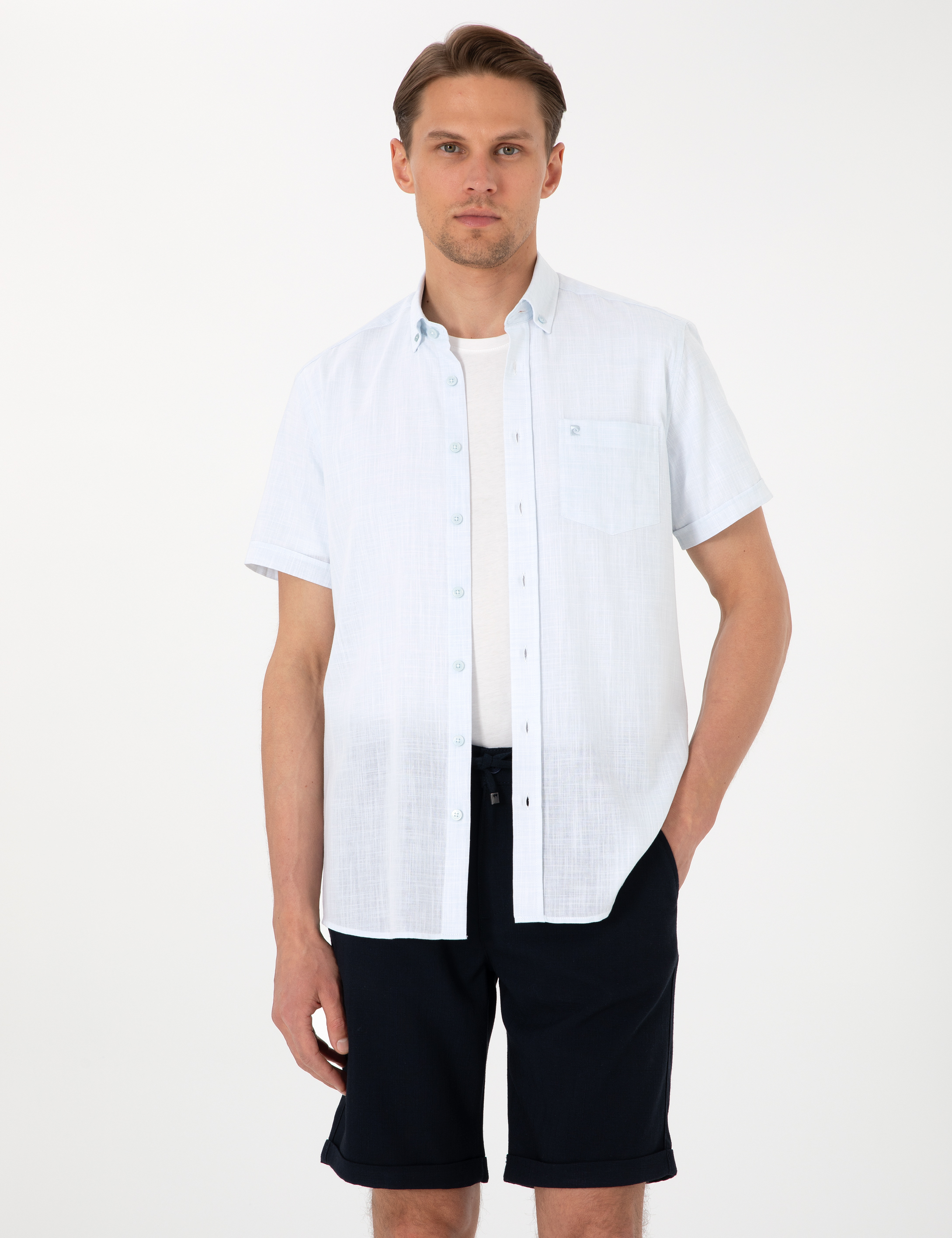 Açık Mavi Keten Görünümlü Regular Fit Kısa Kollu Cepli Gömlek