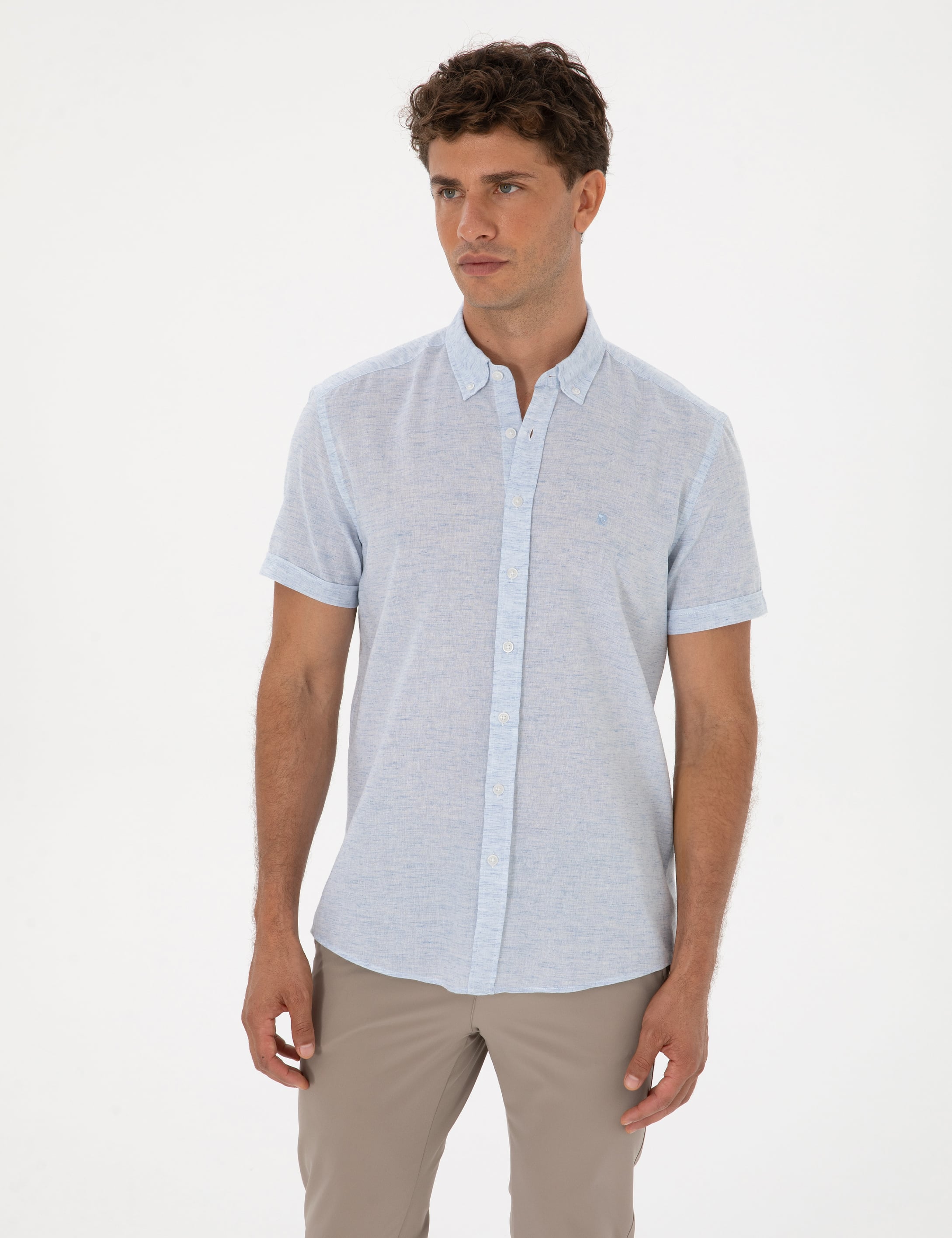 Açık Mavi Keten Karışımlı Regular Fit Kısa Kollu Gömlek