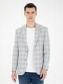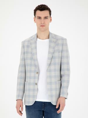 Açık Mavi Slim Fit Keten Karışımlı Ekose Ceket