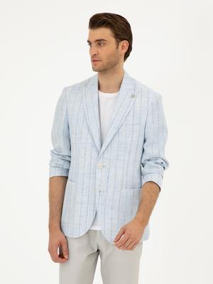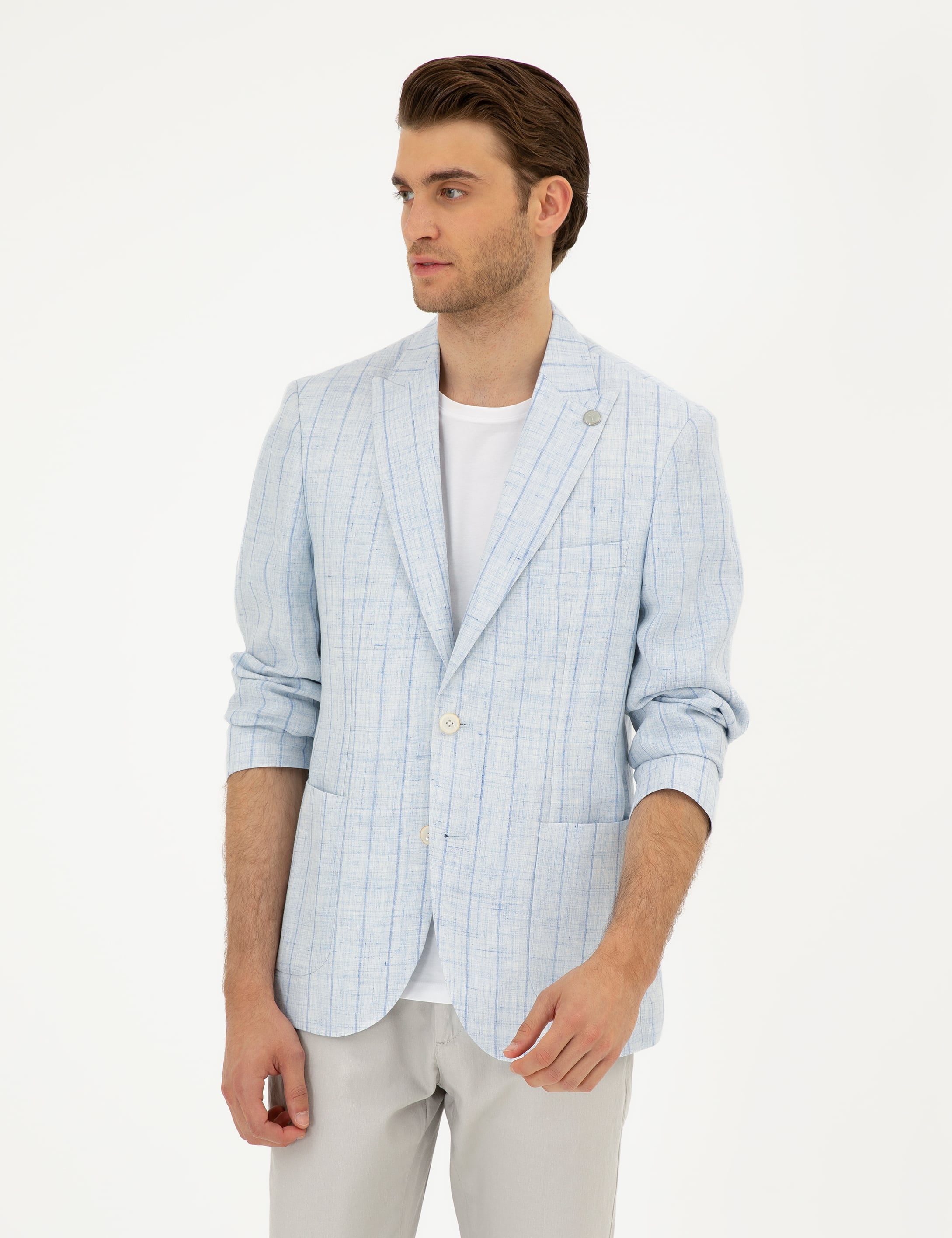 Açık Mavi Slim Fit %100 Keten Çizgili Ceket