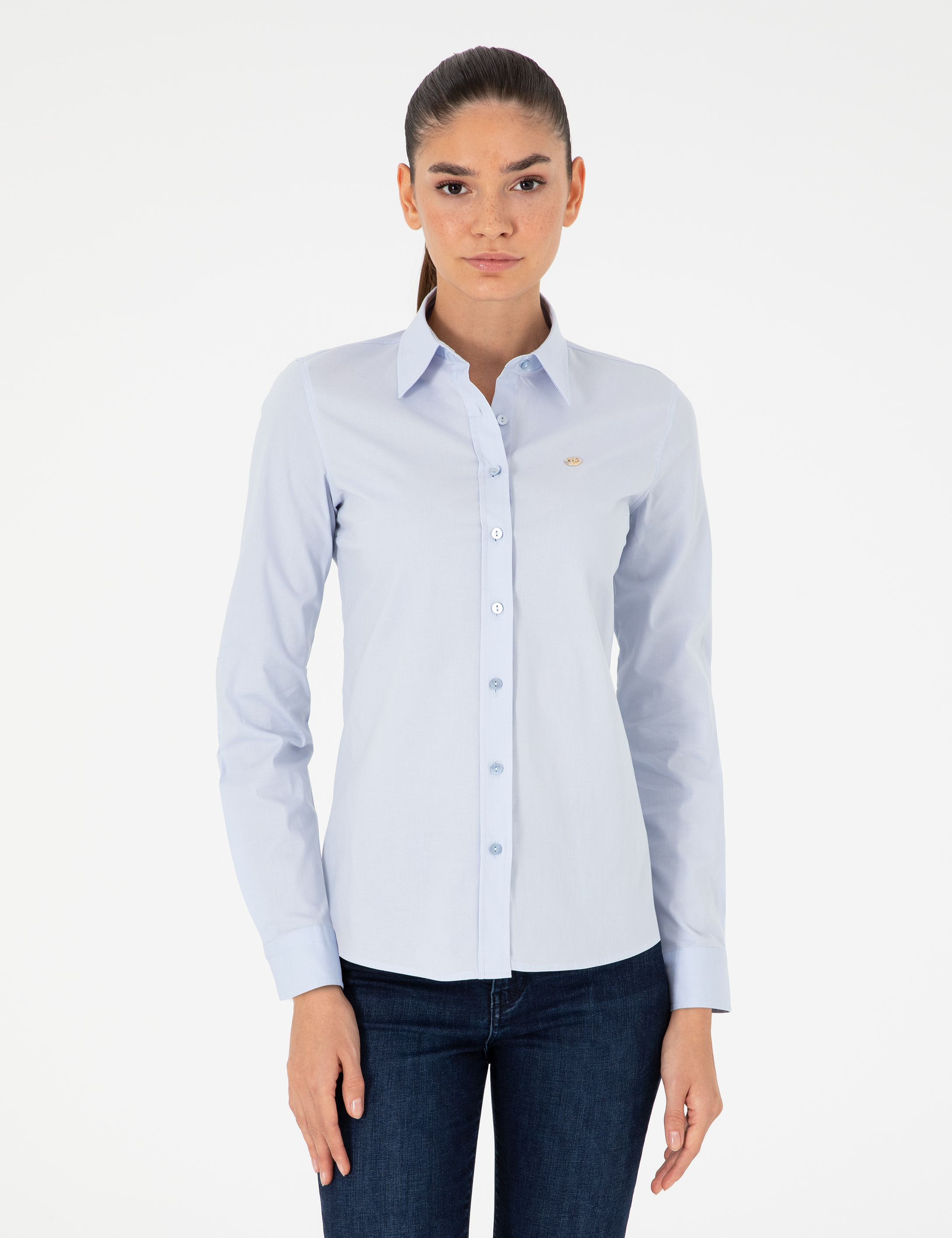 Açık mavi gömlek slim fit kalıbıyla vücuda oturan yapısıyla kusursuz bir siluet oluştururken, hafif esnek kumaşı sayesinde hareket özgürlüğü sağlar. Nefes alabilen ve yumuşak dokulu kumaşı, gün boyu konfor sunarak cildi rahatsız etmeden zarif bir duruş sergiler. Klasik yaka detayı zamansız bir şıklık kazandırırken, düğmeli kapanışı sayesinde hem fonksiyonel hem de estetik bir kullanım sunar.