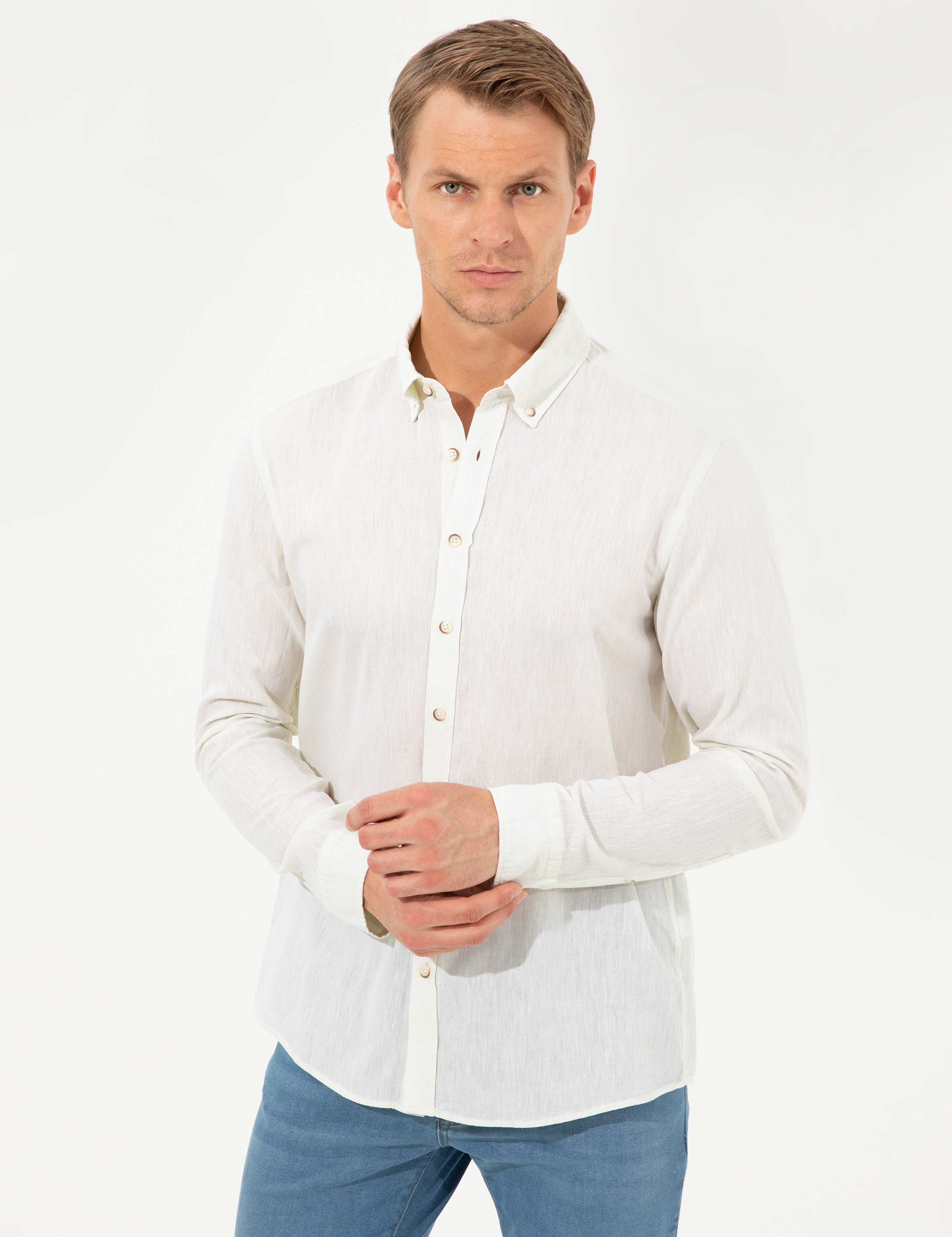 Açık Yeşil Keten Karışımlı Regular Fit Uzun Kollu Gömlek