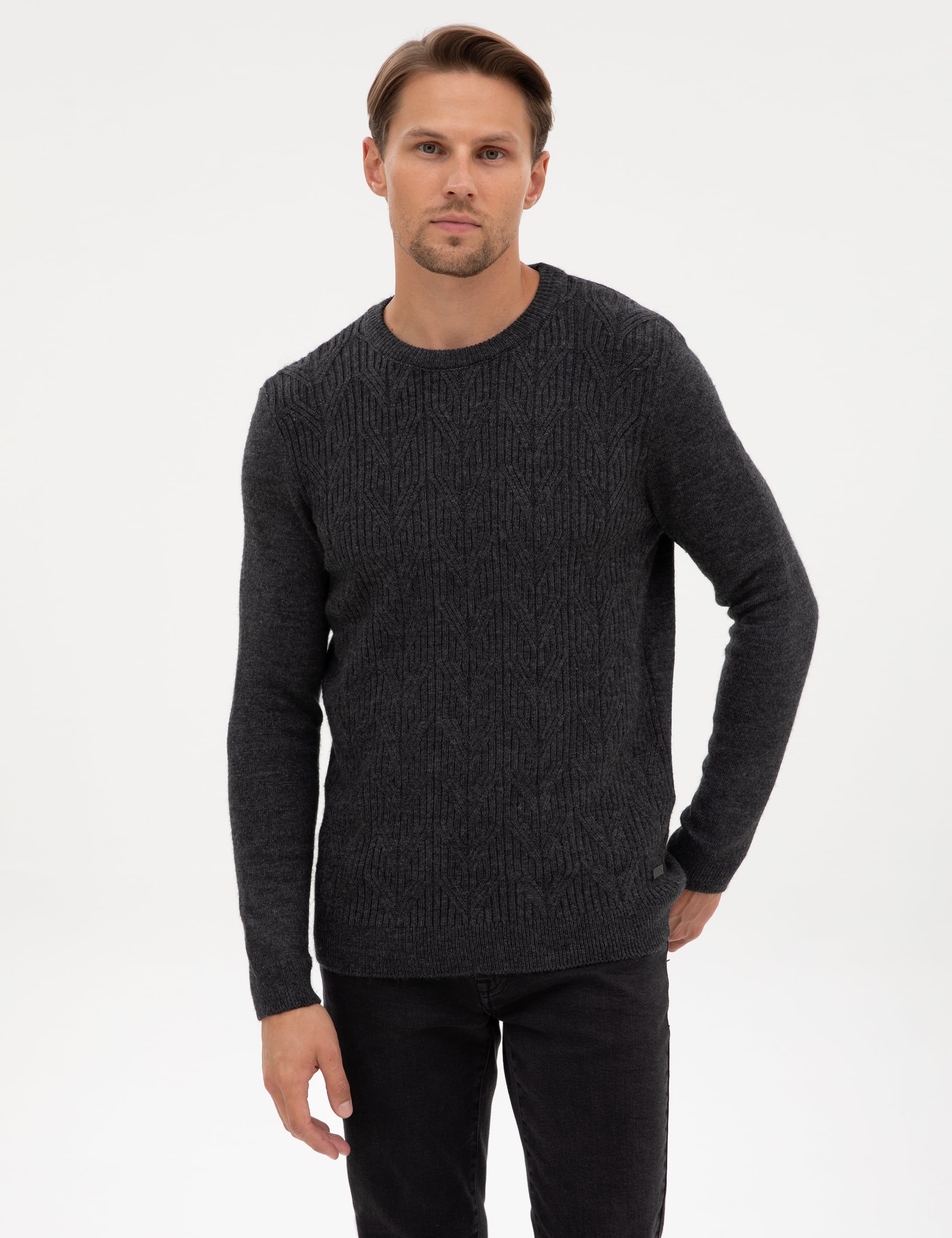 - Antrasit Melanj Regular Fit Bisiklet Yaka Triko Kazak