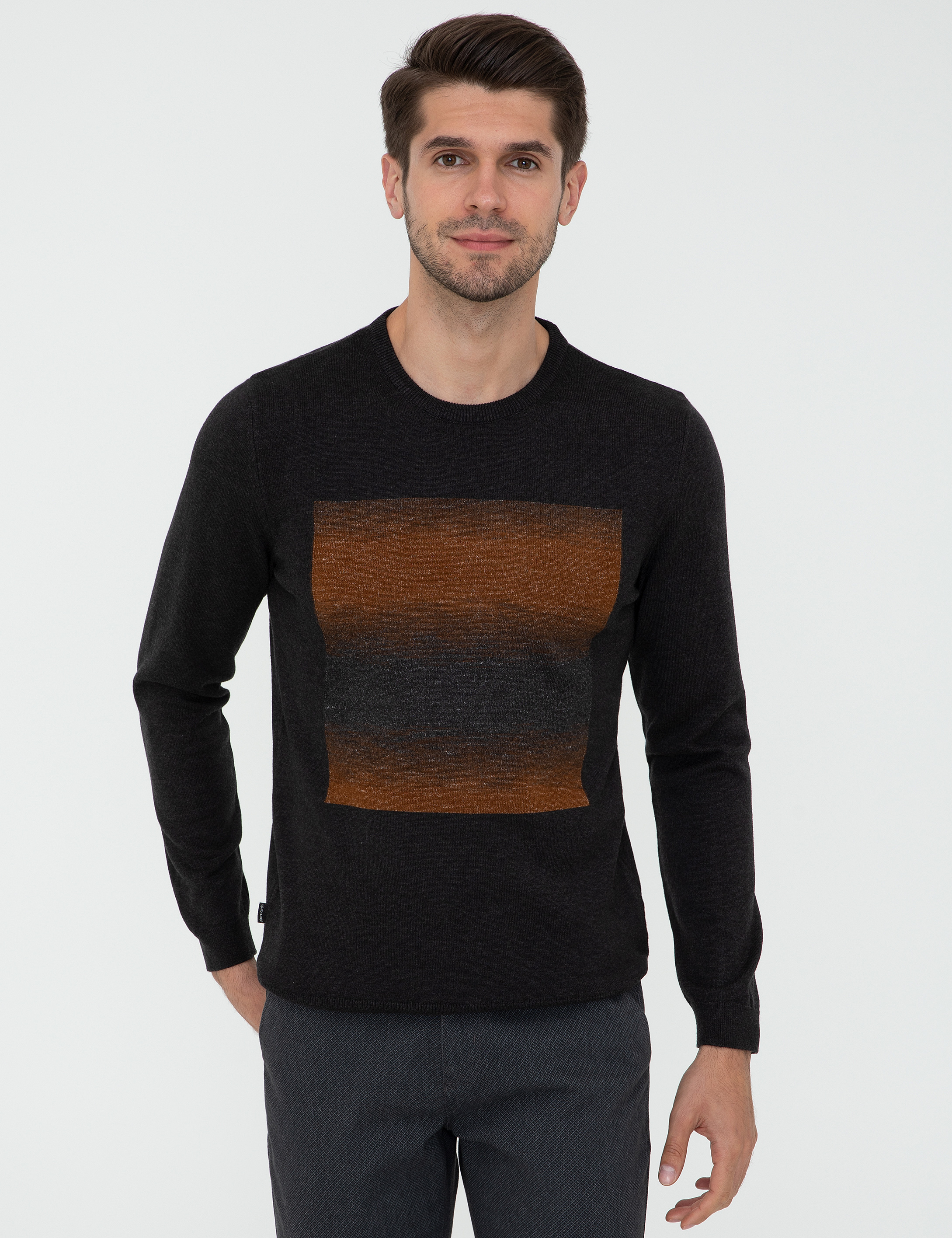 - Antrasit Melanj Slim Fit Bisiklet Yaka Triko Kazak