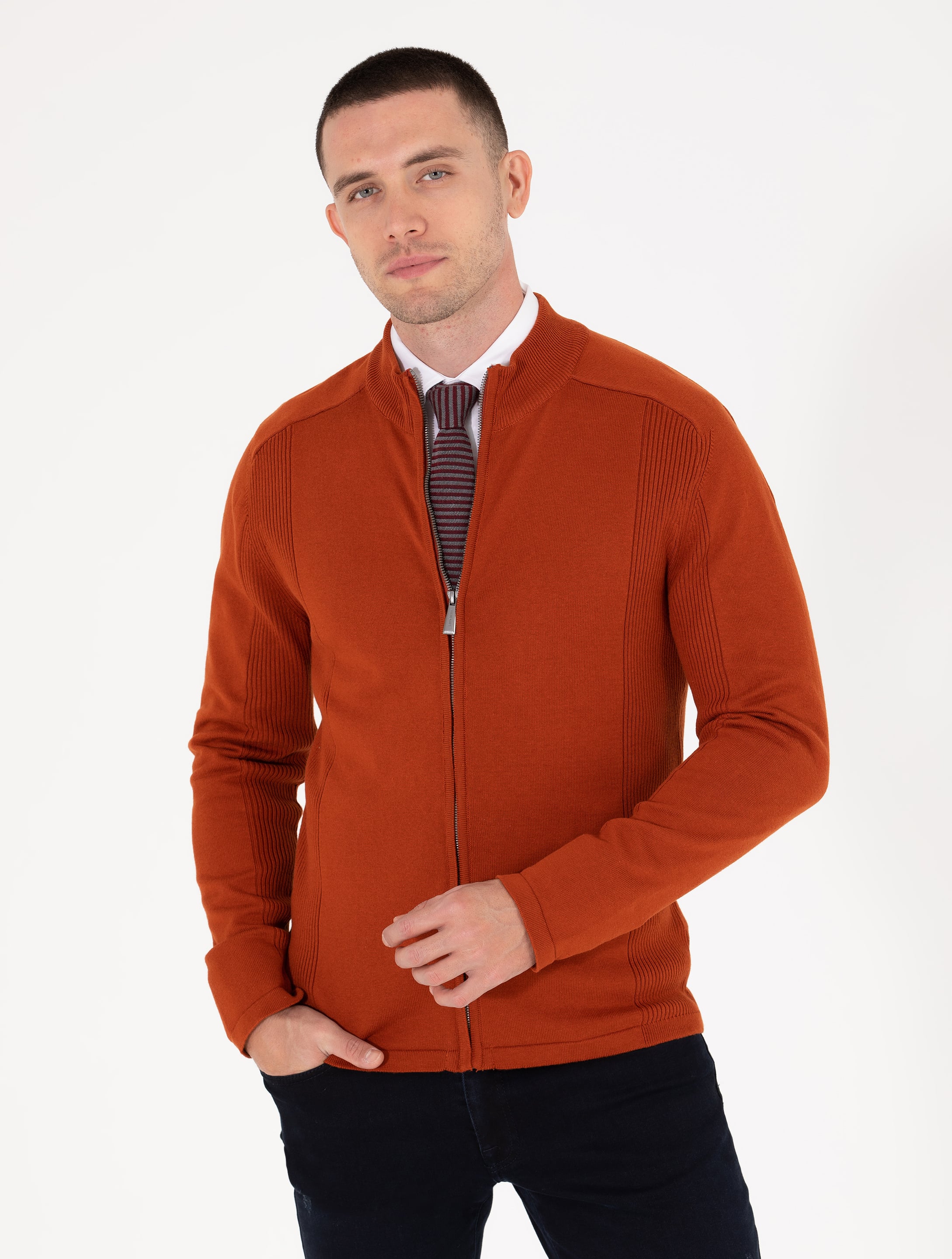 Kahverengi Slim Fit Fermuarlı Triko Hırka