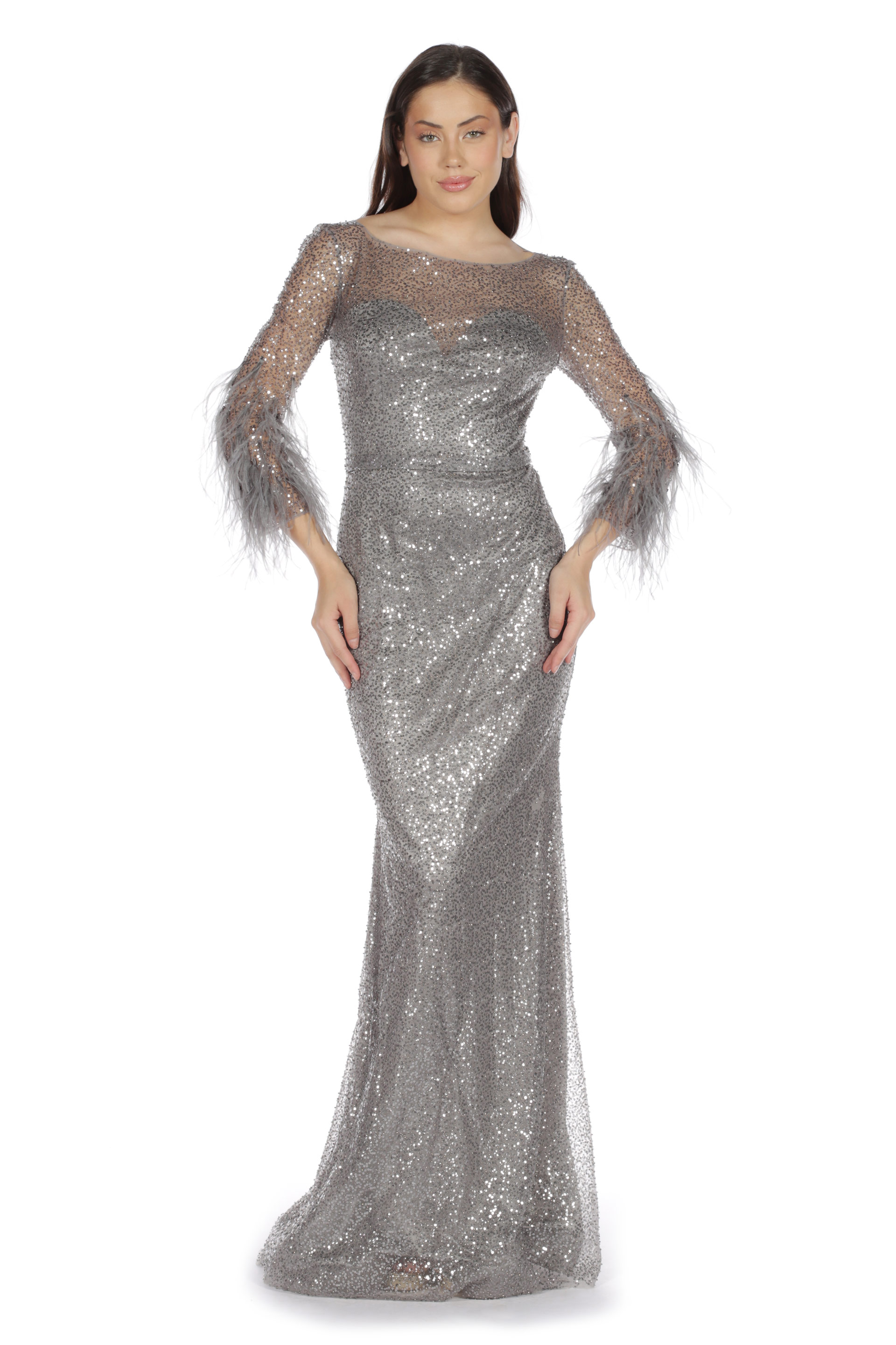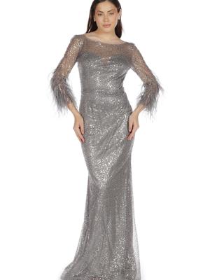 Gri Simli Kolları Tüylü Balık Abiye Elbise.Bu abiyeyi söz elbisesi, düğün abiyesi veya nişan abiyesi olarak kullanabilirsiniz.Bu abiyenin içindeyken Pierre Cardin şıklığını hissedeceksiniz.