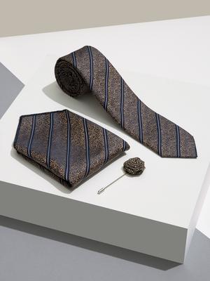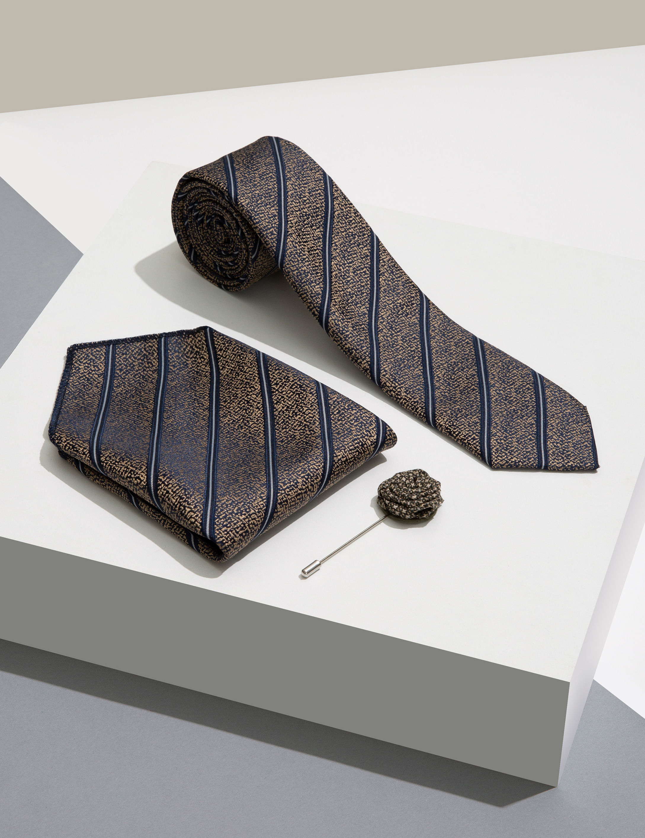 - Bej 3'lü Kravat-Mendil-Kravat İğnesi Set