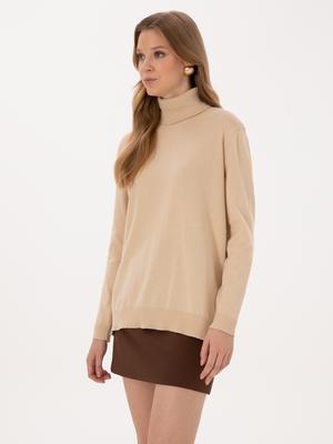 Bej Comfort Fit Tam Balıkçı Yaka Basic Kazak