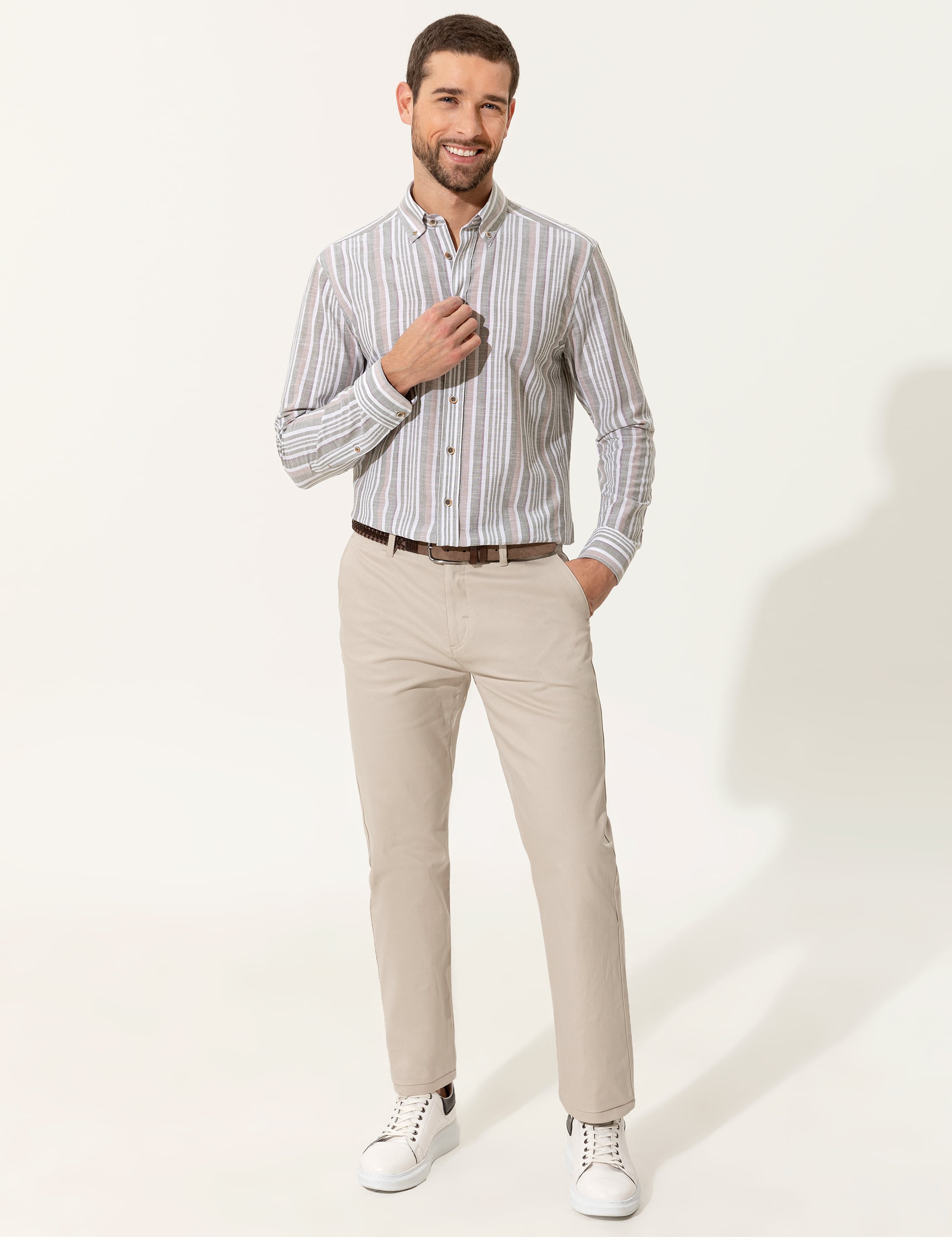 Konforu ve incelikli tasarımıyla dikkat çeken basic regular fit chino pantolon modelimiz yeni sezon tasarımları arasındadır. Pamuk, elastan ve spandeks karışımlı erkek chino pantolon modelimiz benzersiz rahatlığının yanı sıra esnek kullanımıyla da kıyafet deneyiminizi kusursuzlaştırıyor.