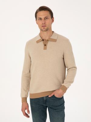 - Bej Regular Fit %100 Yün Polo Yaka Düğmeli Triko Kazak
