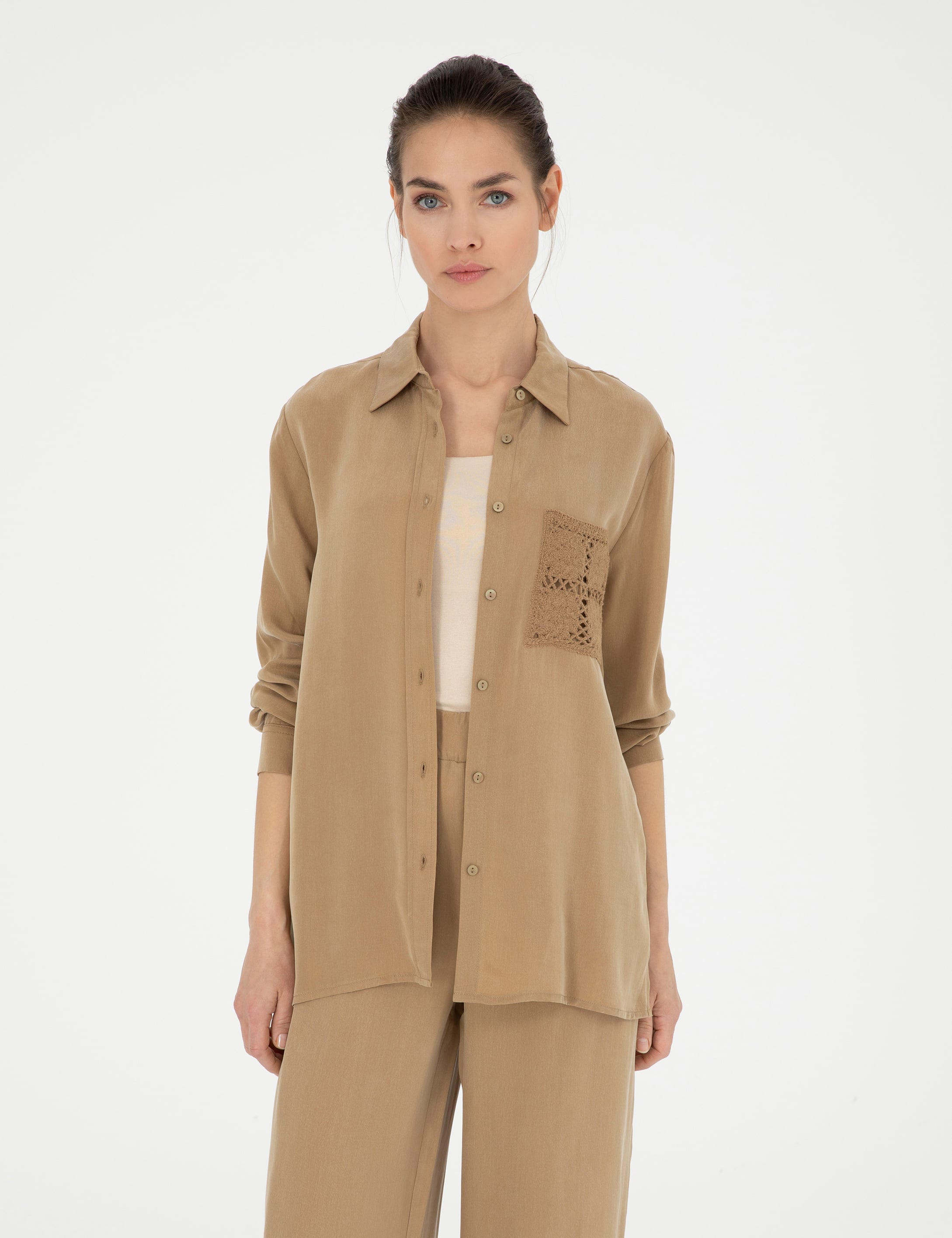 - Bej Cupro Regular Fit Uzun Kollu Gömlek