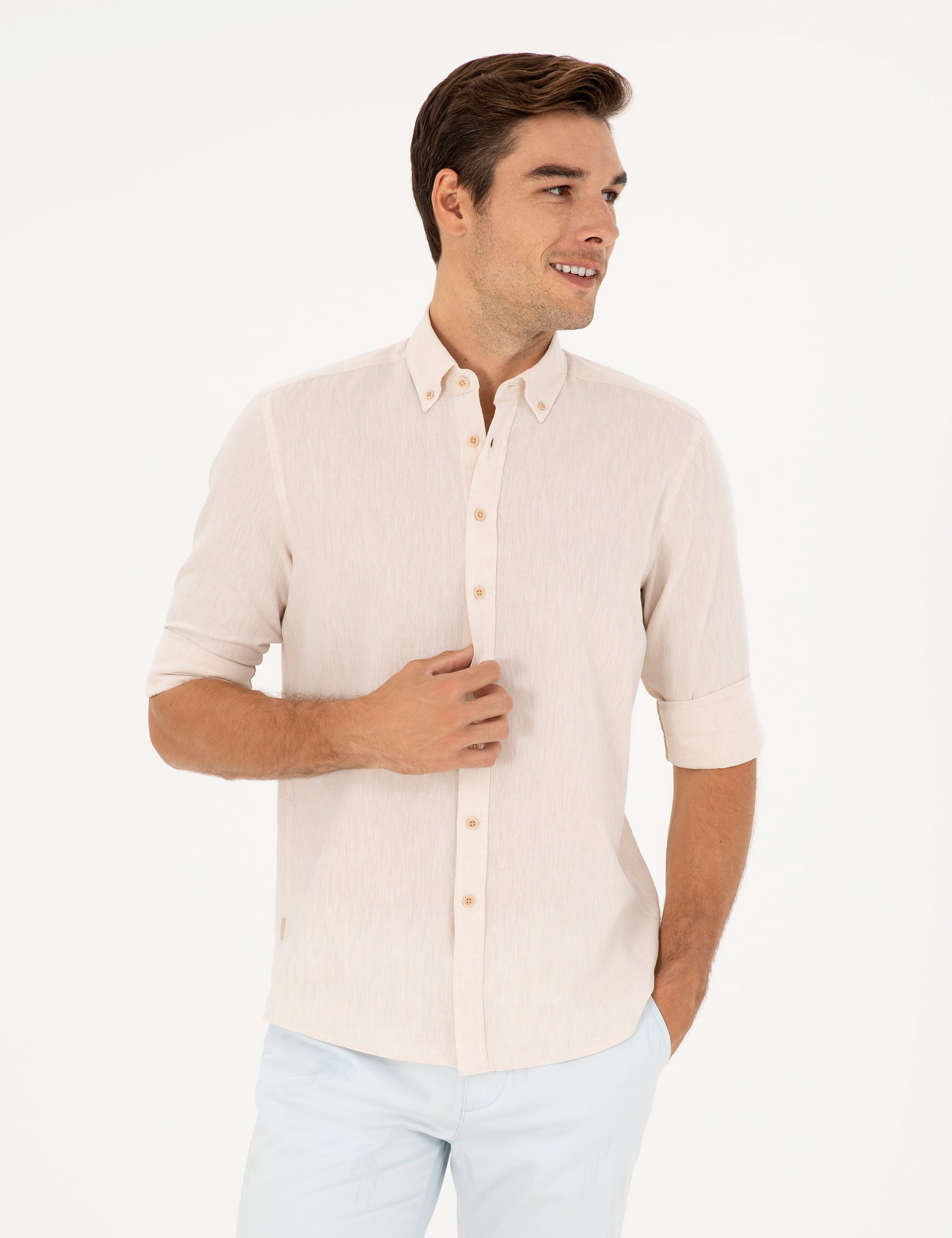 Bej Keten Karışımlı Regular Fit Uzun Kollu Gömlek