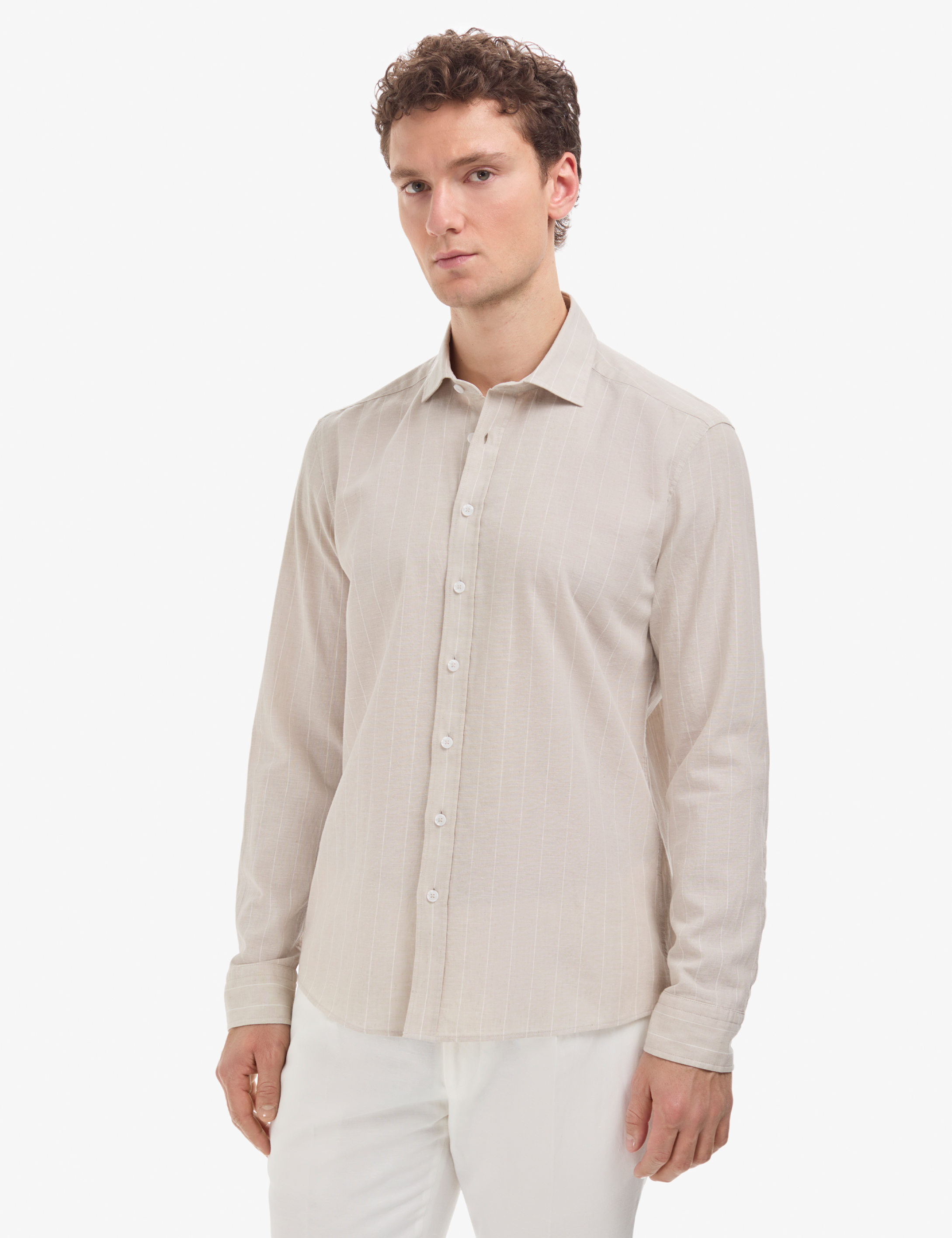 - Bej Keten Karışımlı Regular Fit Çizgili Uzun Kollu Gömlek