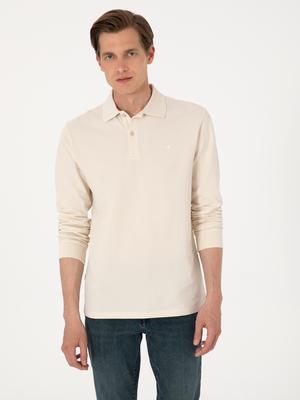 Bej Slim Fit Kıvrılmaz Polo Yaka Basic Pike Sweatshirt