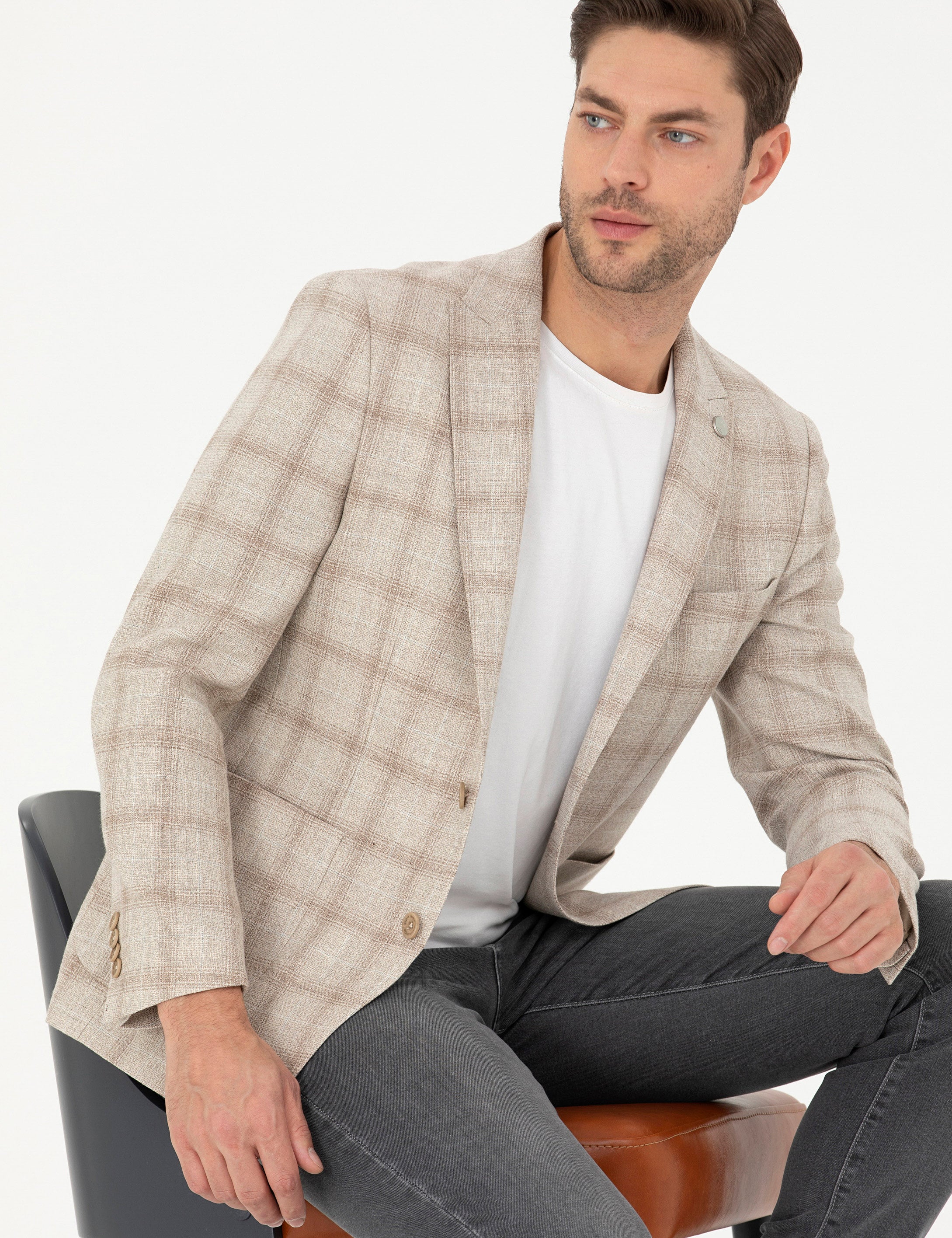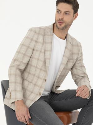 Bej Slim Fit Keten Karışımlı Ekose Ceket
