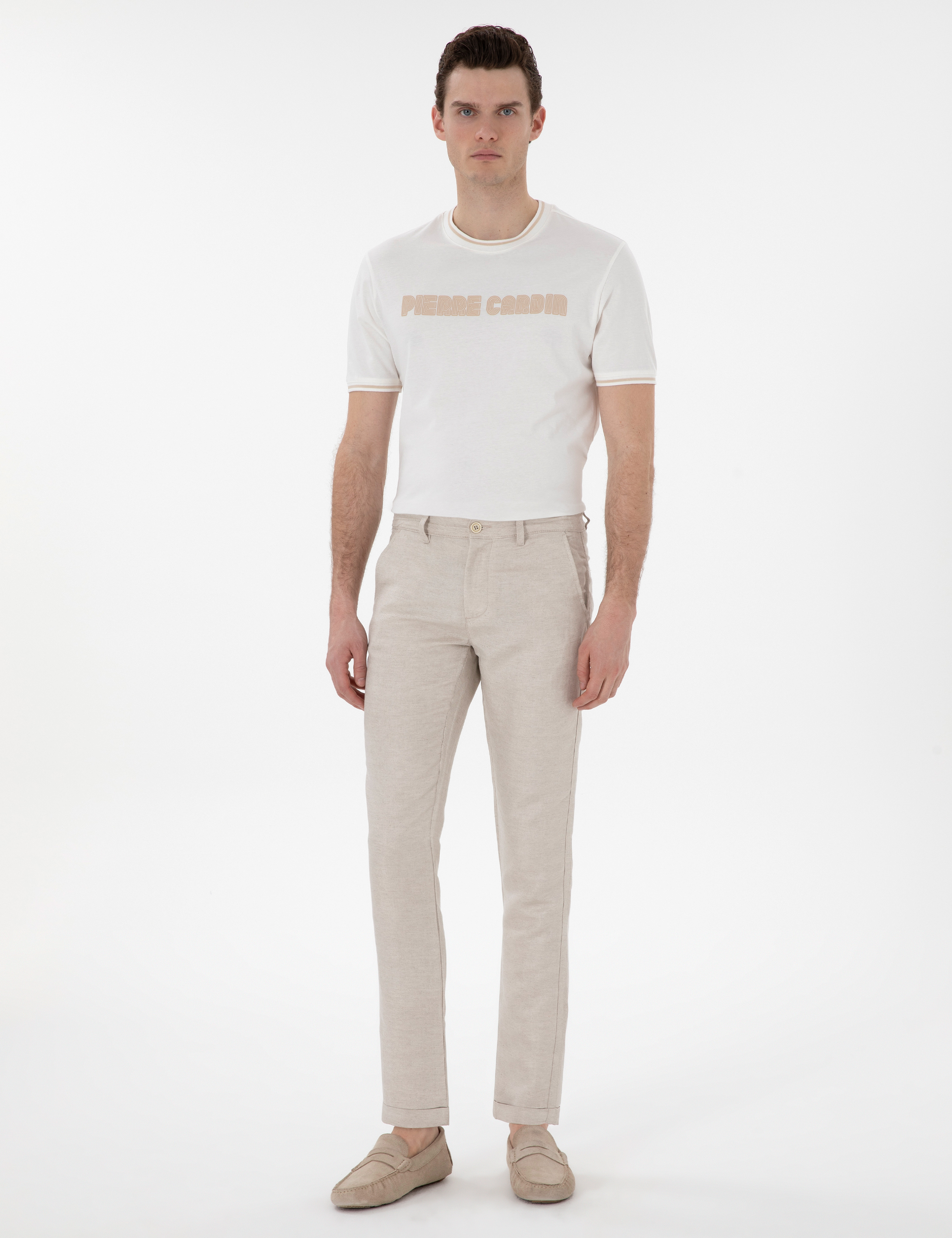 Bej Keten Karışımlı Slim Fit Kanvas Pantolon