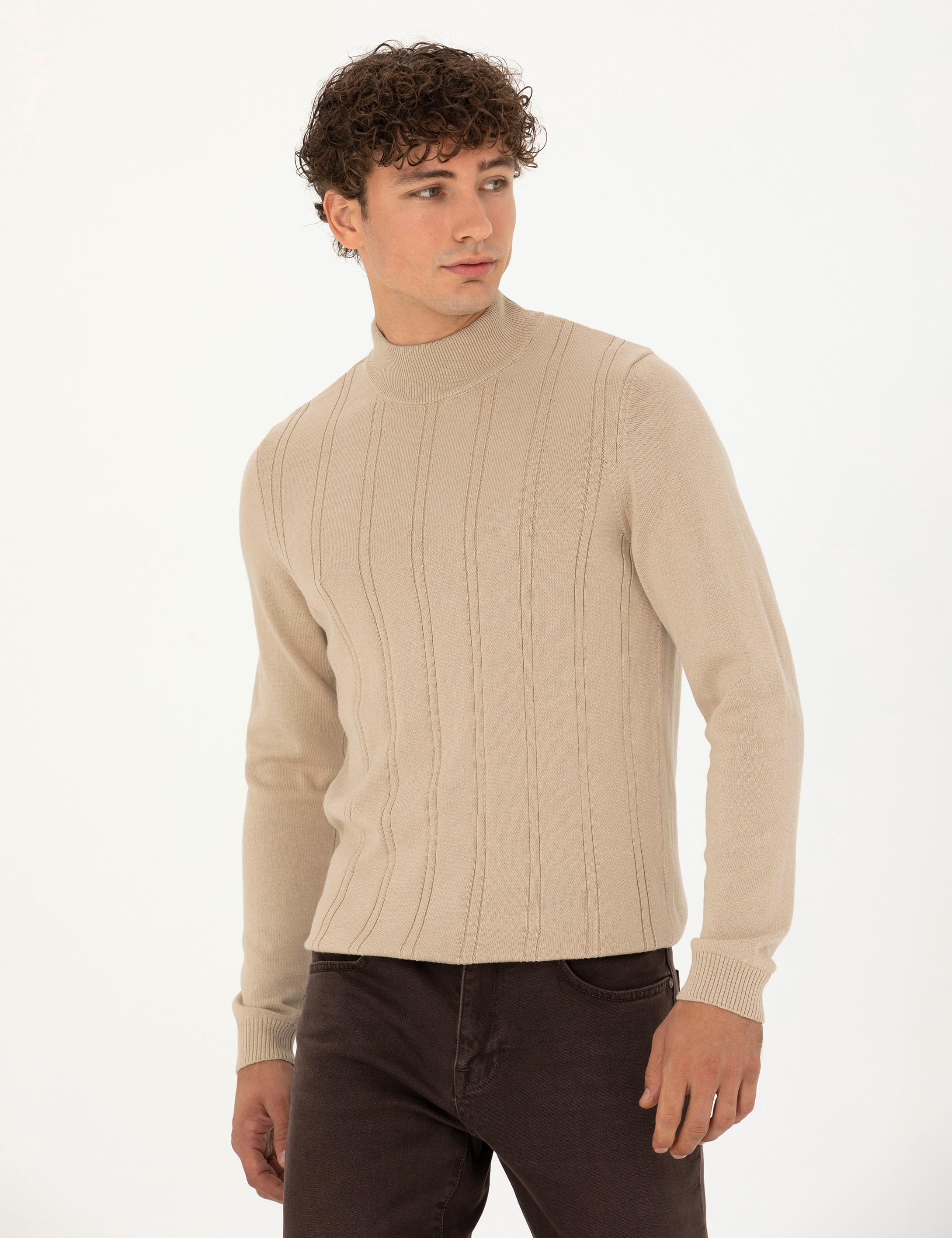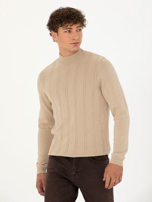 - Bej Slim Fit Yarım Balıkçı Yaka Triko Kazak