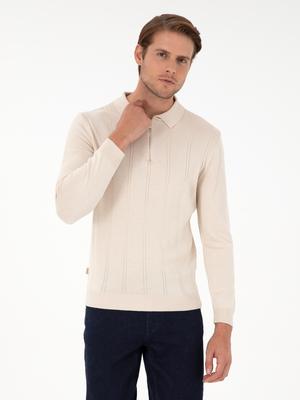 Bej Slim Fit Fermuarlı Polo Yaka Triko Kazak