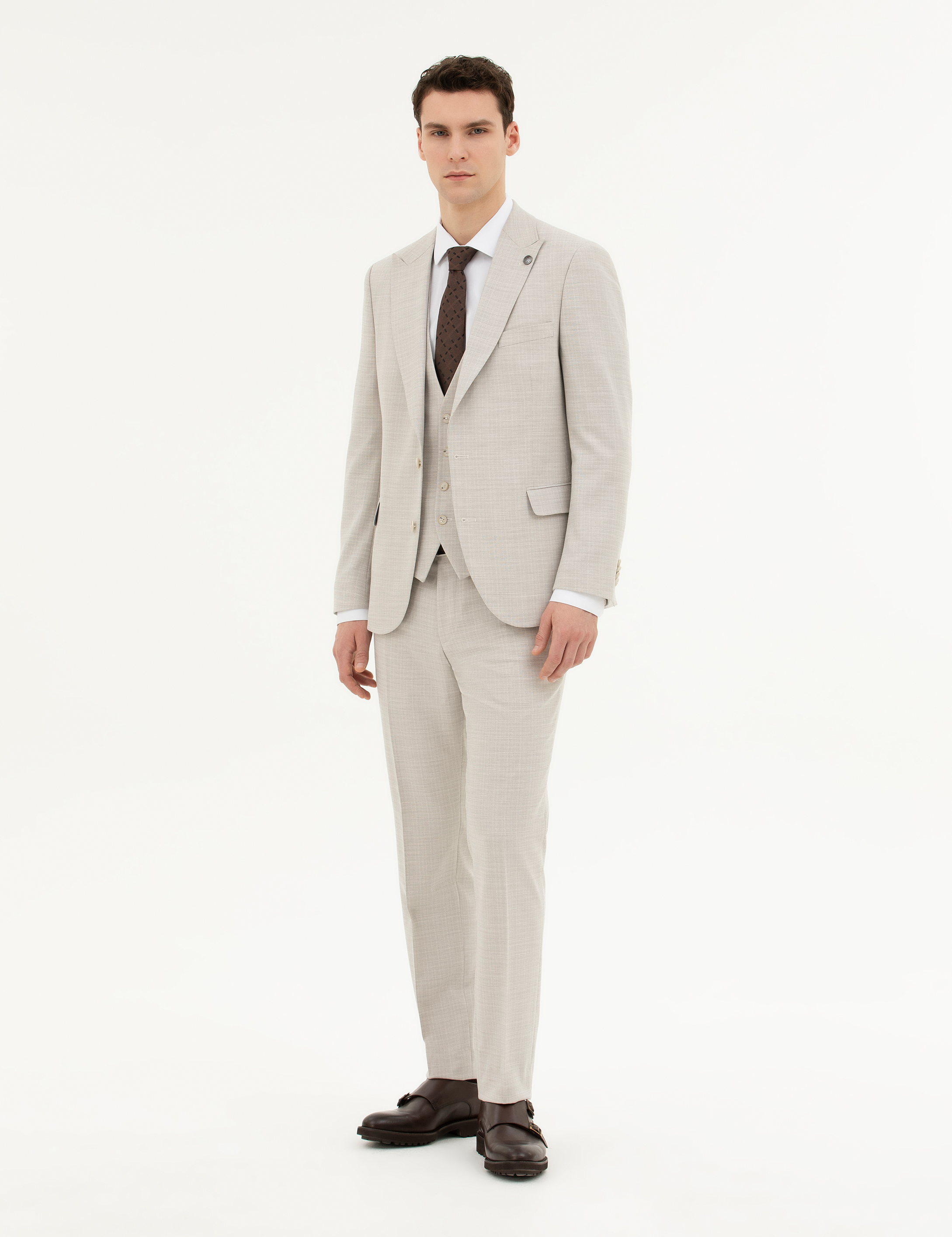 - Bej Slim Fit Yelekli Takım Elbise